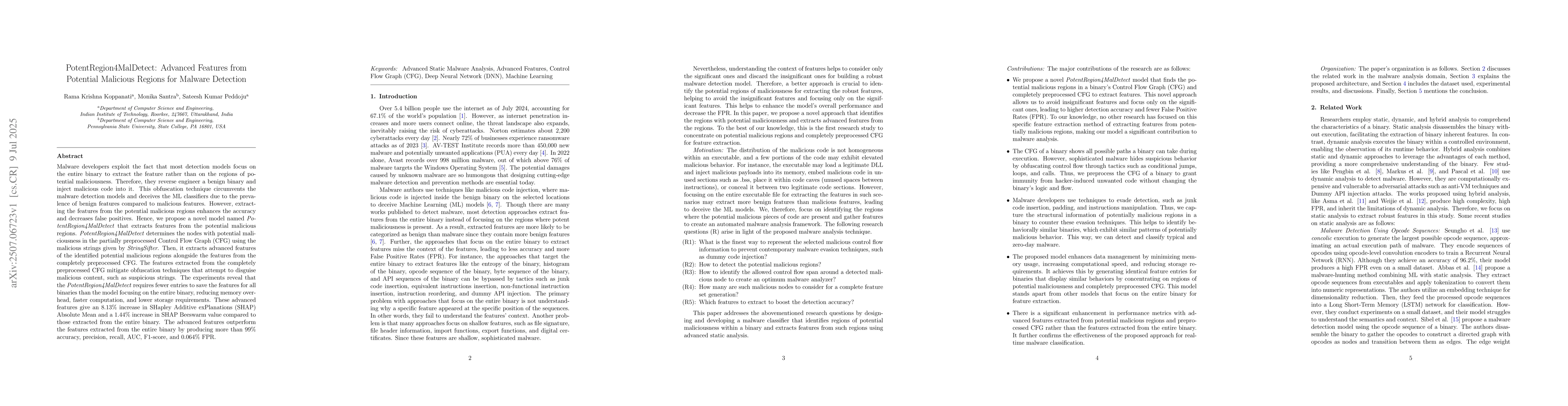 Malware developers exploit the fact that most detection models focus on the entire binary to extract the feature rather than on the regions of potential maliciousness. Therefore, they reverse engineer a benign binary and inject malicious code into it. This obfuscation technique circumvents the malware detection models and deceives the ML classifiers due to the prevalence of benign features compared to malicious features. However, extracting the features from the potential malicious regions enhances the accuracy and decreases false positives. Hence, we propose a novel model named PotentRegion4MalDetect that extracts features from the potential malicious regions. PotentRegion4MalDetect determines the nodes with potential maliciousness in the partially preprocessed Control Flow Graph (CFG) using the malicious strings given by StringSifter. Then, it extracts advanced features of the identified potential malicious regions alongside the features from the completely preprocessed CFG. The features extracted from the completely preprocessed CFG mitigate obfuscation techniques that attempt to disguise malicious content, such as suspicious strings. The experiments reveal that the PotentRegion4MalDetect requires fewer entries to save the features for all binaries than the model focusing on the entire binary, reducing memory overhead, faster computation, and lower storage requirements. These advanced features give an 8.13% increase in SHapley Additive exPlanations (SHAP) Absolute Mean and a 1.44% increase in SHAP Beeswarm value compared to those extracted from the entire binary. The advanced features outperform the features extracted from the entire binary by producing more than 99% accuracy, precision, recall, AUC, F1-score, and 0.064% FPR.