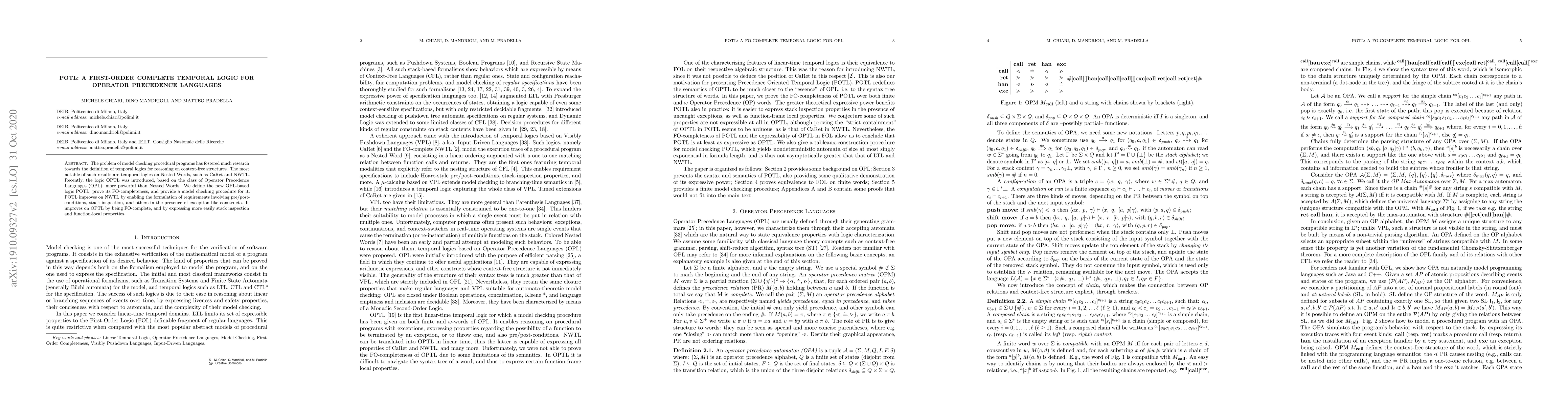 The problem of model checking procedural programs has fostered much research towards the definition of temporal logics for reasoning on context-free structures. The most notable of such results are temporal logics on Nested Words, such as CaRet and NWTL. Recently, the logic OPTL was introduced, based on the class of Operator Precedence Languages (OPL), more powerful than Nested Words. We define the new OPL-based logic POTL, prove its FO-completeness, and provide a model checking procedure for it. POTL improves on NWTL by enabling the formulation of requirements involving pre/post-conditions, stack inspection, and others in the presence of exception-like constructs. It improves on OPTL by being FO-complete, and by expressing more easily stack inspection and function-local properties.