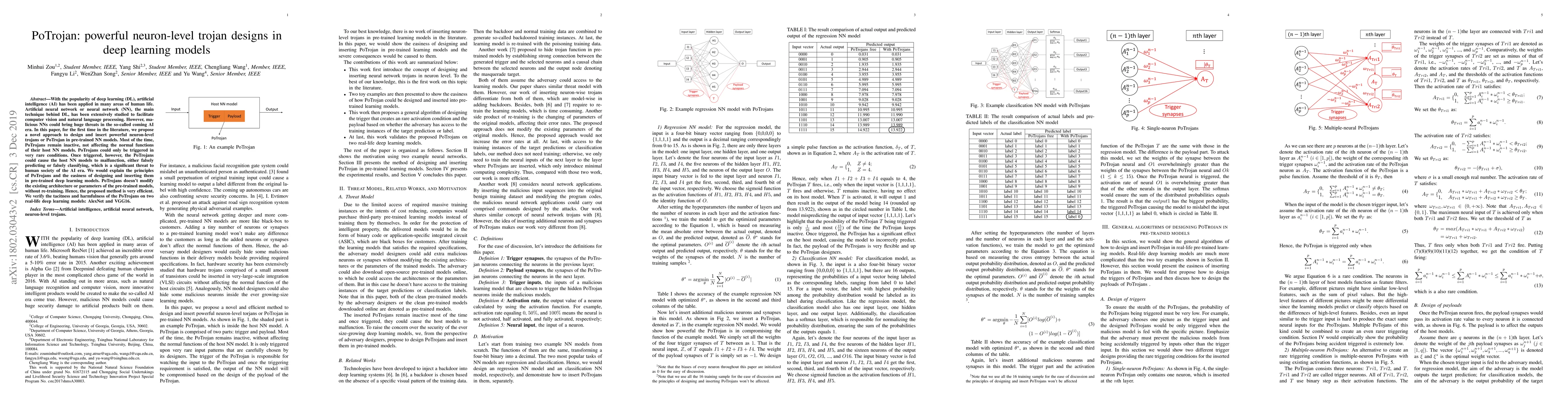 With the popularity of deep learning (DL), artificial intelligence (AI) has been applied in many areas of human life. Neural network or artificial neural network (NN), the main technique behind DL, has been extensively studied to facilitate computer vision and natural language recognition. However, the more we rely on information technology, the more vulnerable we are. That is, malicious NNs could bring huge threat in the so-called coming AI era. In this paper, for the first time in the literature, we propose a novel approach to design and insert powerful neural-level trojans or PoTrojan in pre-trained NN models. Most of the time, PoTrojans remain inactive, not affecting the normal functions of their host NN models. PoTrojans could only be triggered in very rare conditions. Once activated, however, the PoTrojans could cause the host NN models to malfunction, either falsely predicting or classifying, which is a significant threat to human society of the AI era. We would explain the principles of PoTrojans and the easiness of designing and inserting them in pre-trained deep learning models. PoTrojans doesn't modify the existing architecture or parameters of the pre-trained models, without re-training. Hence, the proposed method is very efficient.