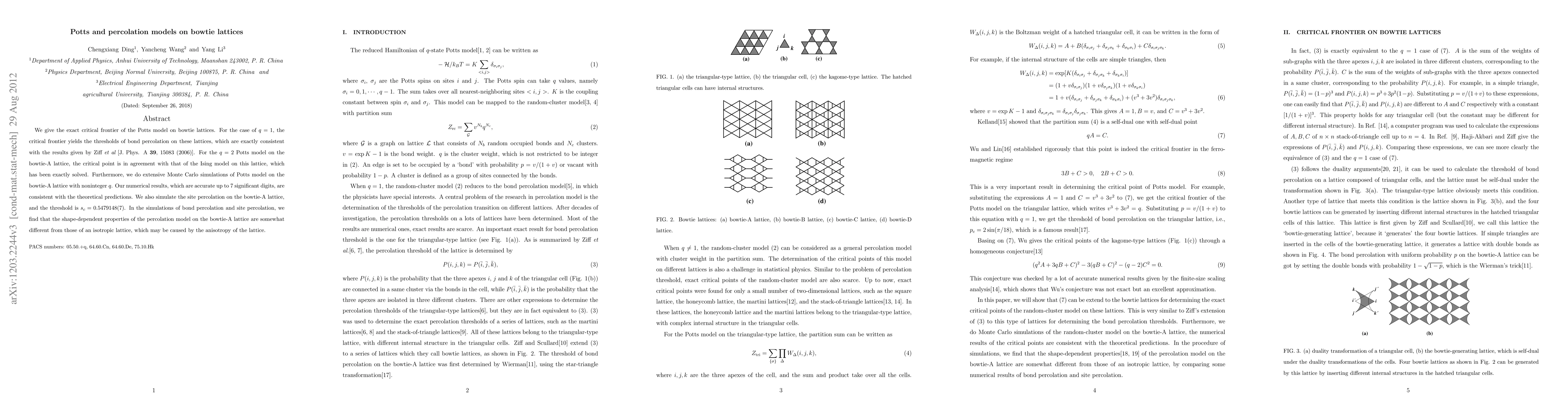 This paper presents the exact critical frontier for the Potts model on bowtie lattices and confirms the thresholds of bond percolation on these lattices, aligning with previous results. The study also verifies the critical point for the $q=2$ Potts model on the bowtie-A lattice through Monte Carlo simulations and finds distinct percolation properties due to the lattice's anisotropy.