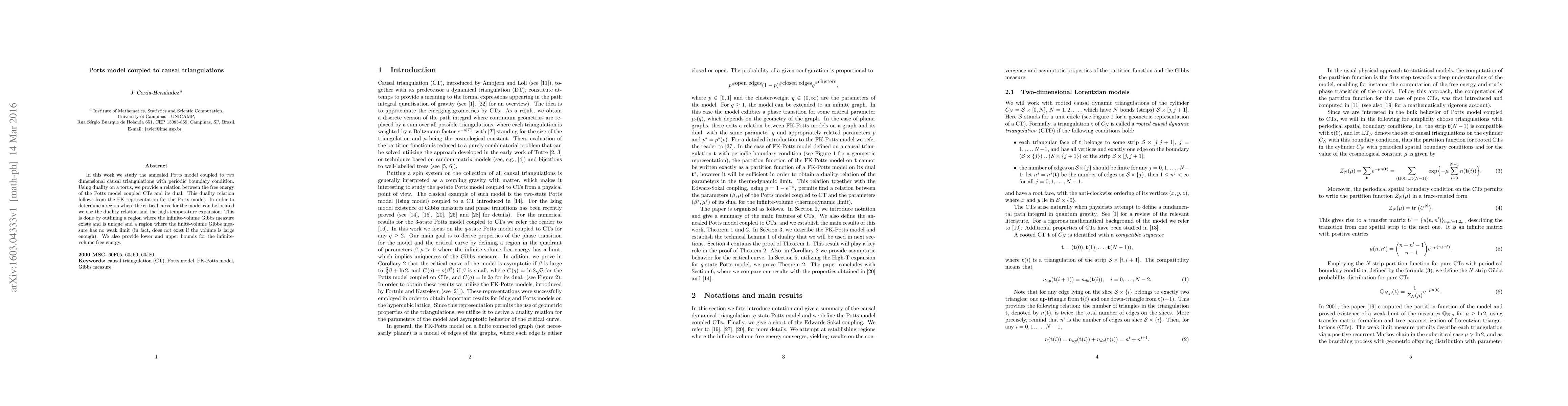 In this work we study the annealed Potts model coupled to two dimensional causal triangulations with periodic boundary condition. Using duality on a torus, we provide a relation between the free energy of the Potts model coupled CTs and its dual. This duality relation follows from the FK representation for the Potts model. In order to determine a region where the critical curve for the model can be located we use the duality relation and the high-temperature expansion. This is done by outlining a region where the infinite-volume Gibbs measure exists and is unique and a region where the finite-volume Gibbs mea- sure has no weak limit (in fact, does not exist if the volume is large enough). We also provide lower and upper bounds for the infinite- volume free energy.