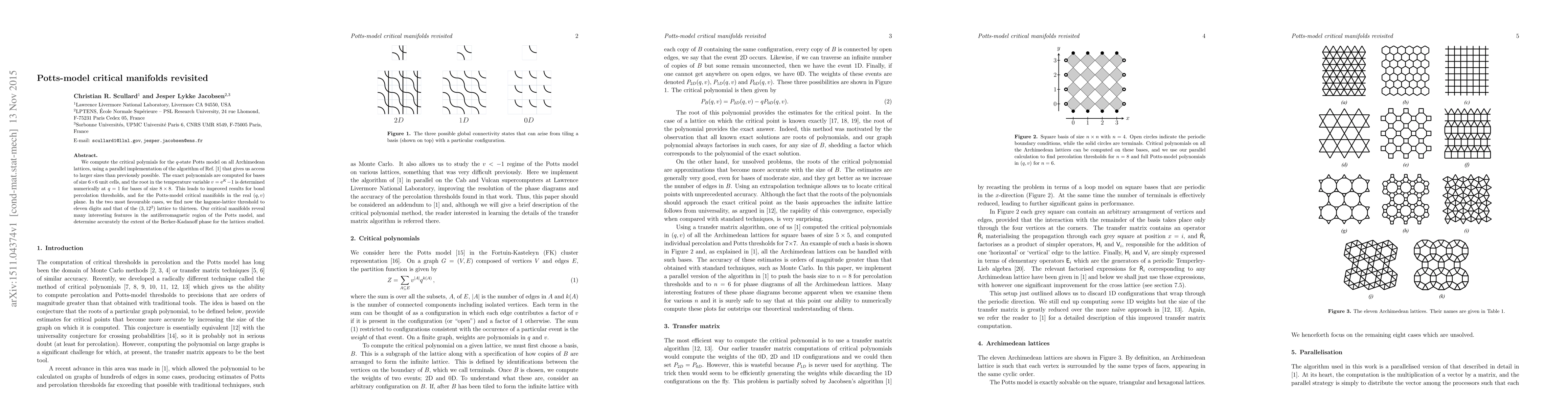 This paper computes the critical polynomials for the q-state Potts model on Archimedean lattices using a parallel algorithm, achieving higher precision results for bond percolation thresholds and Potts-model critical manifolds. Notably, it determines the kagome-lattice threshold to eleven digits and the $(3,12^2)$ lattice threshold to thirteen digits.