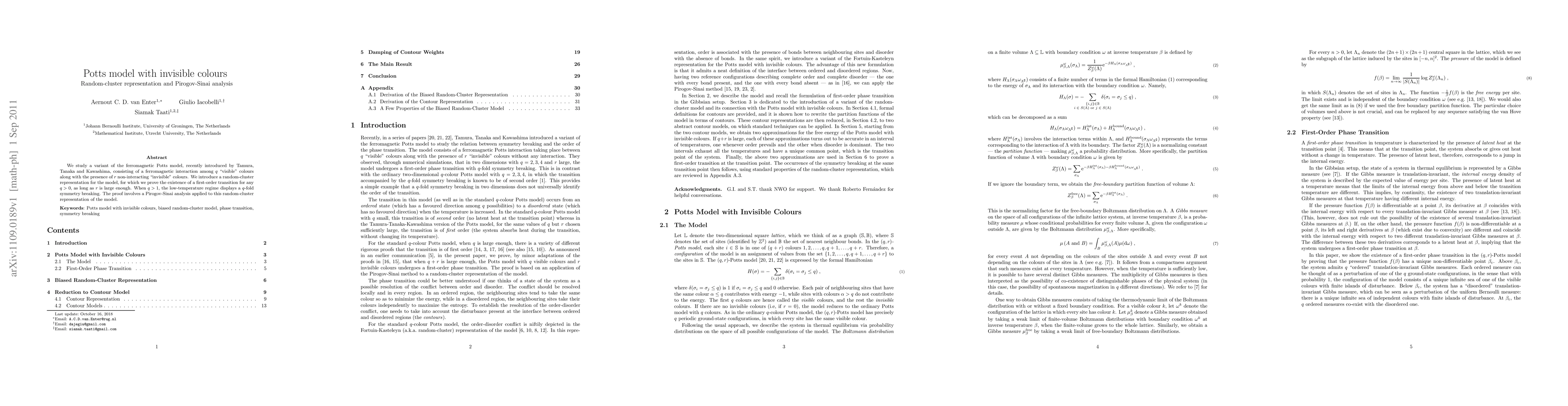 This paper investigates a modified Potts model with visible and invisible colours, introducing a random-cluster representation. The study proves a first-order phase transition for sufficiently large invisible colour counts and reveals $q$-fold symmetry breaking at low temperatures, employing Pirogov-Sinai analysis.