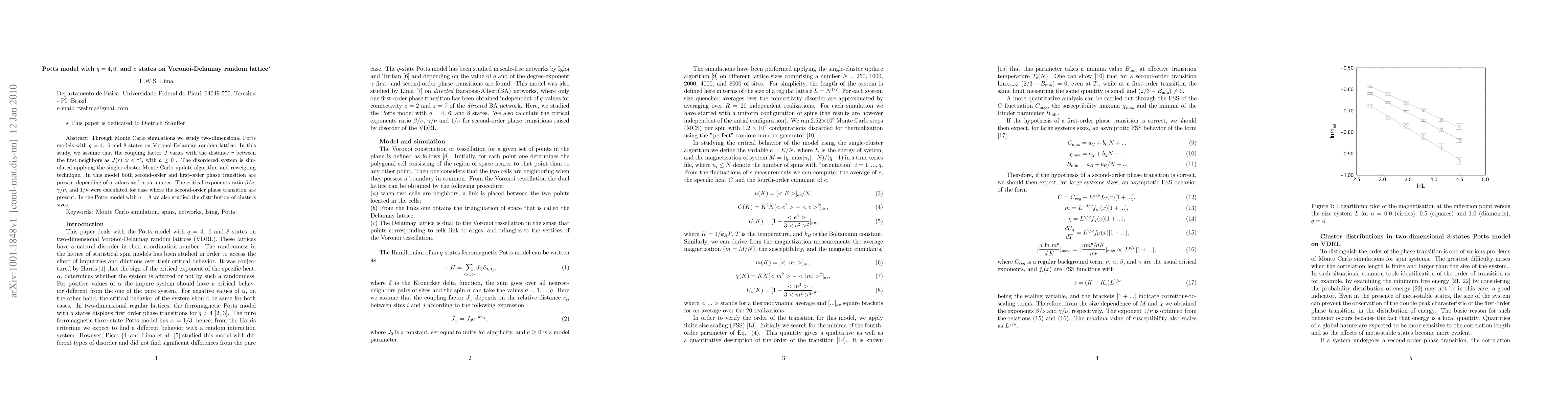 This paper investigates two-dimensional Potts models with 4, 6, and 8 states on Voronoi-Delaunay random lattices using Monte Carlo simulations. The study finds both first- and second-order phase transitions depending on the number of states and the distance-dependent coupling factor. Critical exponents ratios and cluster size distributions are also analyzed.