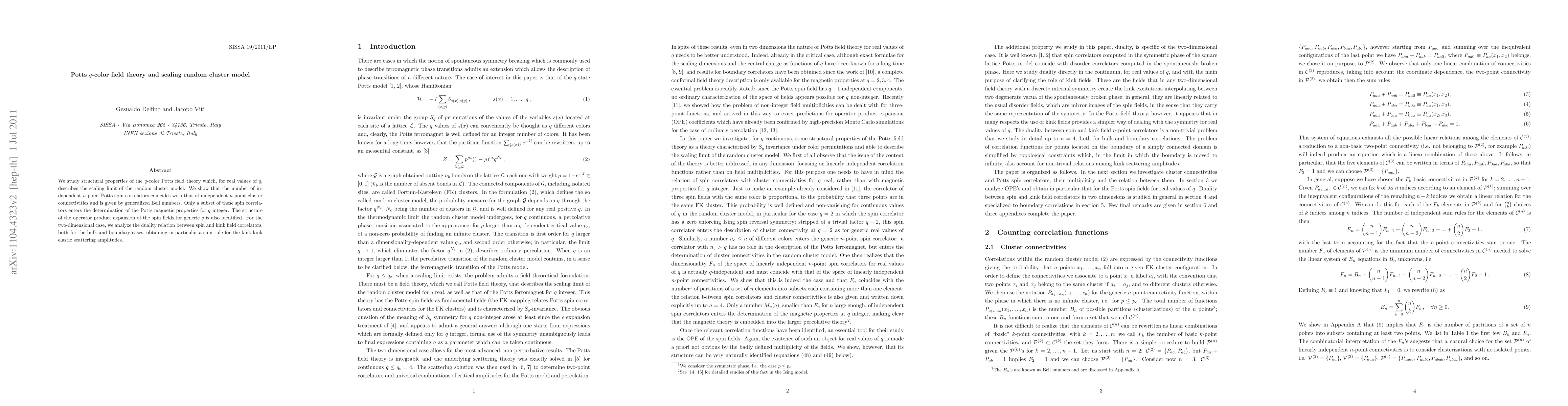 This paper investigates the structural properties of the Potts q-color field theory, which represents the scaling limit of the random cluster model. It finds that the number of independent spin correlators matches the number of independent cluster connectivities, governed by generalized Bell numbers.