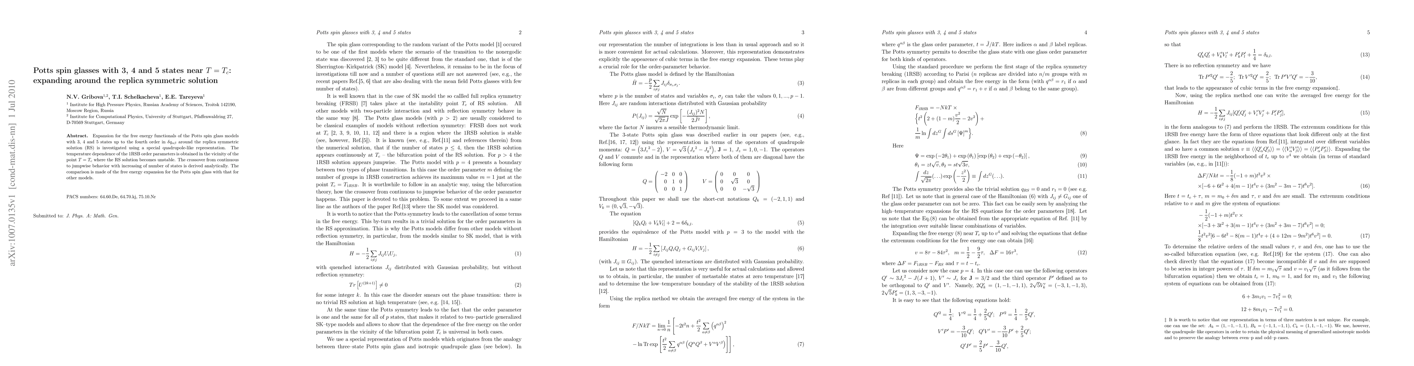 Expansion for the free energy functionals of the Potts spin glass models with 3, 4 and 5 states up to the fourth order in $\delta q_{\alpha \beta }$ around the replica symmetric solution (RS) is investigated using a special quadrupole-like representation. The temperature dependence of the 1RSB order parameters is obtained in the vicinity of the point $T=T_c$ where the RS solution becomes unstable. The crossover from continuous to jumpwise behavior with increasing of number of states is derived analytically. The comparison is made of the free energy expansion for the Potts spin glass with that for other models.