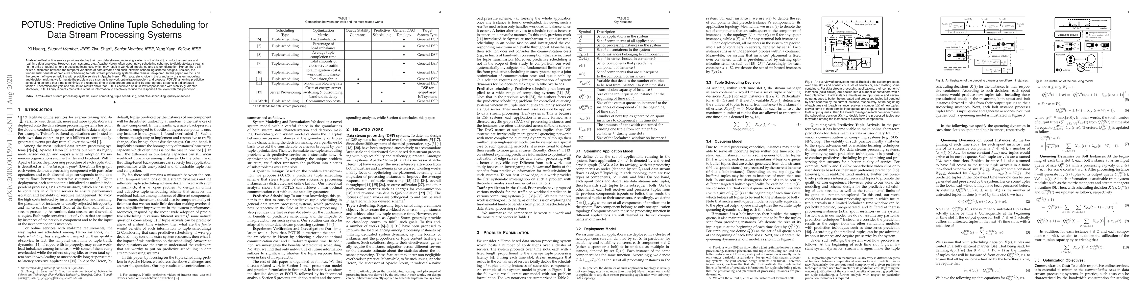POTUS introduces a predictive online tuple scheduling scheme for Apache Heron to optimize data stream processing by minimizing response time through adaptive distribution of data streams, achieving low response times and stability with minimal future information.