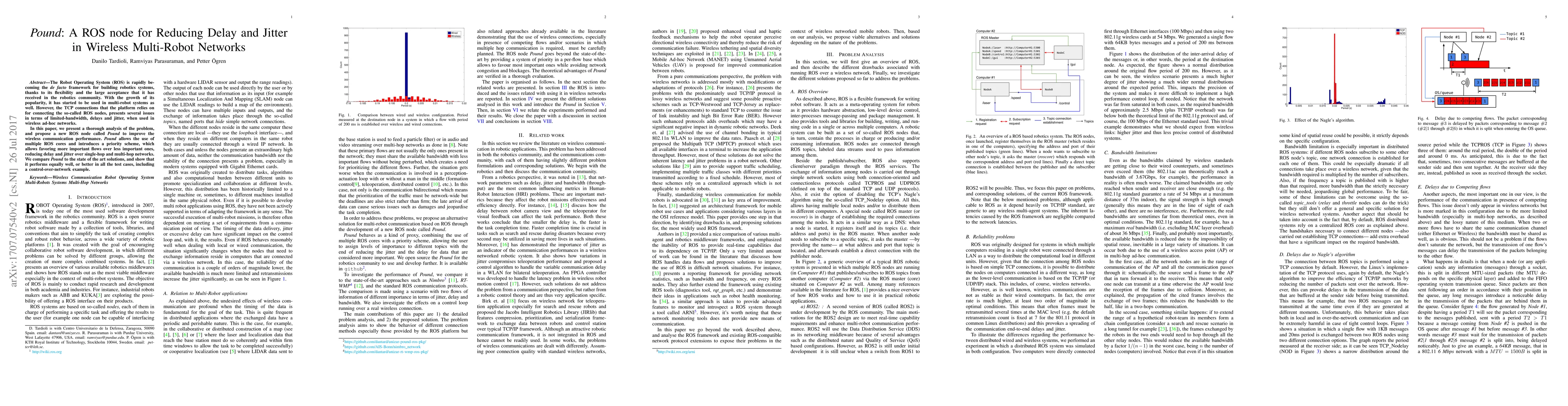 This research is significant as it identifies the limitations of standard ROS communication protocols in wireless multi-robot networks and proposes Pound, a novel ROS node that effectively reduces delay and jitter, ensuring better performance for critical applications such as control systems.