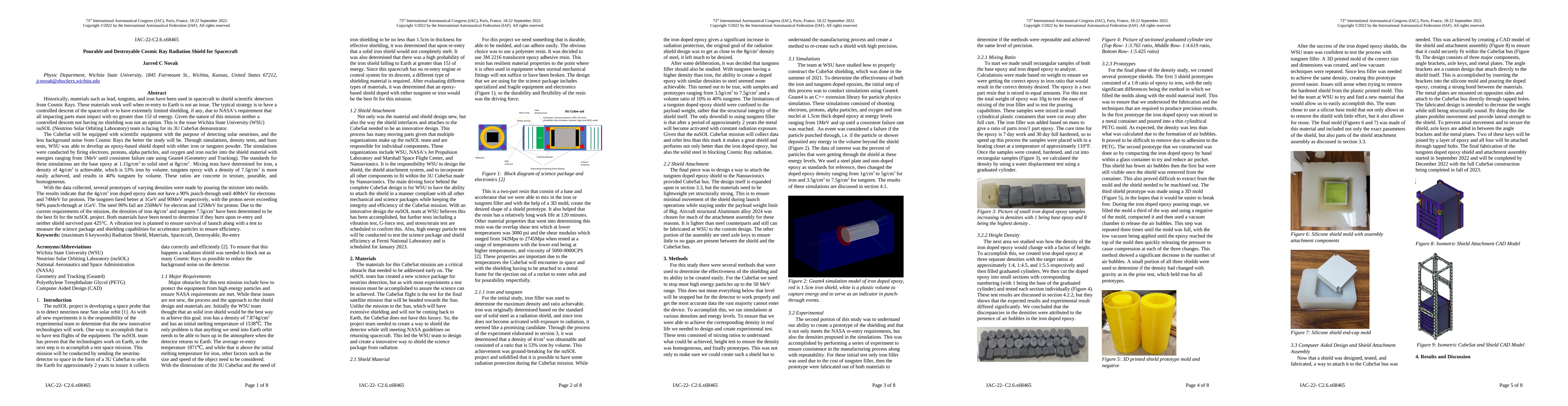Wichita State University's nuSOL team developed a pourable, destroyable epoxy-based shield doped with iron or tungsten powder to protect a 3U CubeSat from cosmic rays while allowing safe reentry. Simulation results indicate the shield's effectiveness and density, achieving optimal shielding with minimal reentry energy impact.