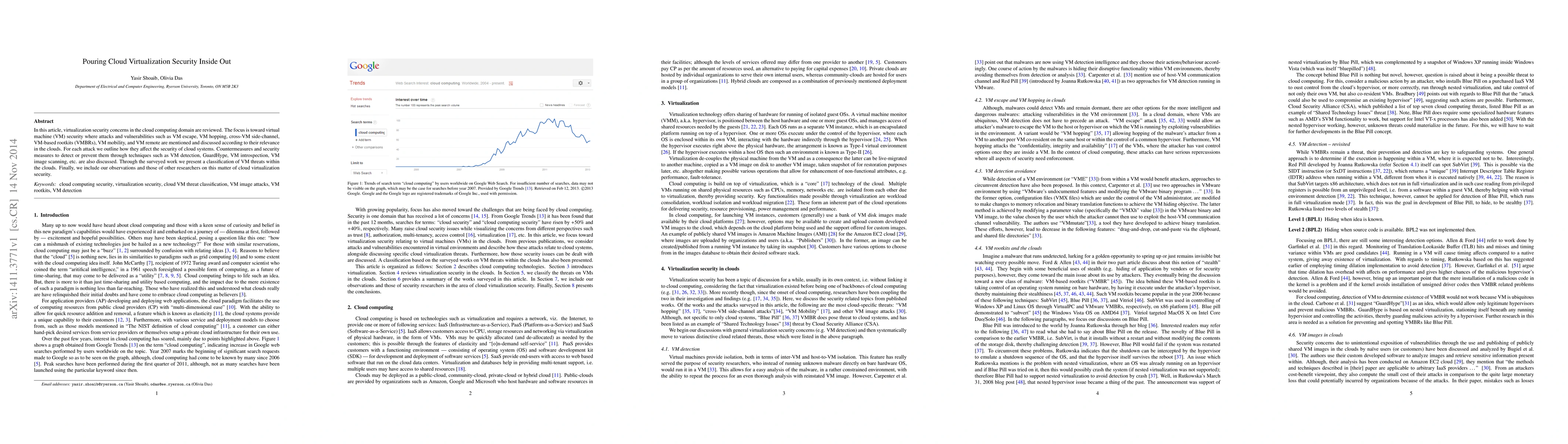 This paper reviews security concerns in cloud virtualization, focusing on various VM attacks, including VM escape and rootkits, and discusses their impact on cloud security. It also explores countermeasures like VM detection and introspection to mitigate these threats, and classifies VM threats within cloud environments.