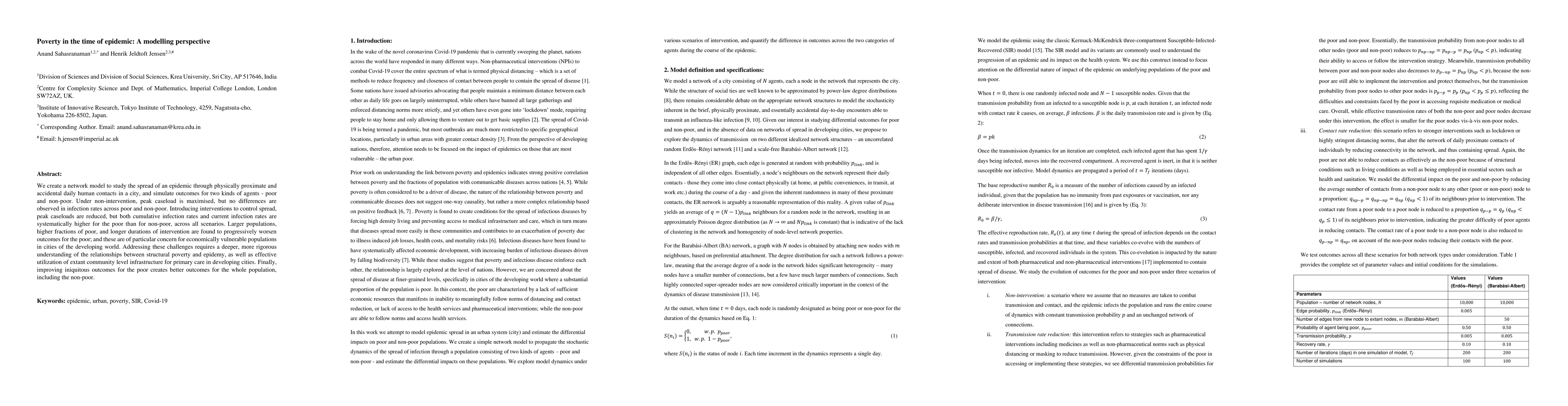 We create a network model to study the spread of an epidemic through physically proximate and accidental daily human contacts in a city, and simulate outcomes for two kinds of agents - poor and non-poor. Under non-intervention, peak caseload is maximised, but no differences are observed in infection rates across poor and non-poor. Introducing interventions to control spread, peak caseloads are reduced, but both cumulative infection rates and current infection rates are systematically higher for the poor than for non-poor, across all scenarios. Larger populations, higher fractions of poor, and longer durations of intervention are found to progressively worsen outcomes for the poor; and these are of particular concern for economically vulnerable populations in cities of the developing world. Addressing these challenges requires a deeper, more rigorous understanding of the relationships between structural poverty and epidemy, as well as effective utilization of extant community level infrastructure for primary care in developing cities. Finally, improving iniquitous outcomes for the poor creates better outcomes for the whole population, including the non-poor.