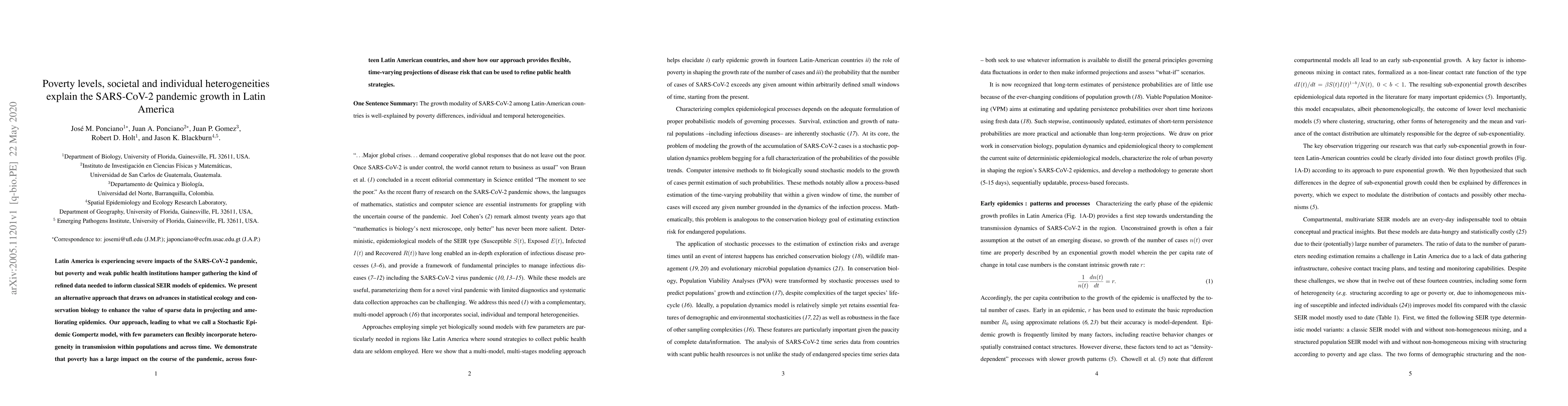 Latin America is experiencing severe impacts of the SARS-CoV-2 pandemic, but poverty and weak public health institutions hamper gathering the kind of refined data needed to inform classical SEIR models of epidemics. We present an alternative approach that draws on advances in statistical ecology and conservation biology to enhance the value of sparse data in projecting and ameliorating epidemics. Our approach, leading to what we call a Stochastic Epidemic Gompertz model, with few parameters can flexibly incorporate heterogeneity in transmission within populations and across time. We demonstrate that poverty has a large impact on the course of the pandemic, across fourteen Latin American countries, and show how our approach provides flexible, time-varying projections of disease risk that can be used to refine public health strategies.