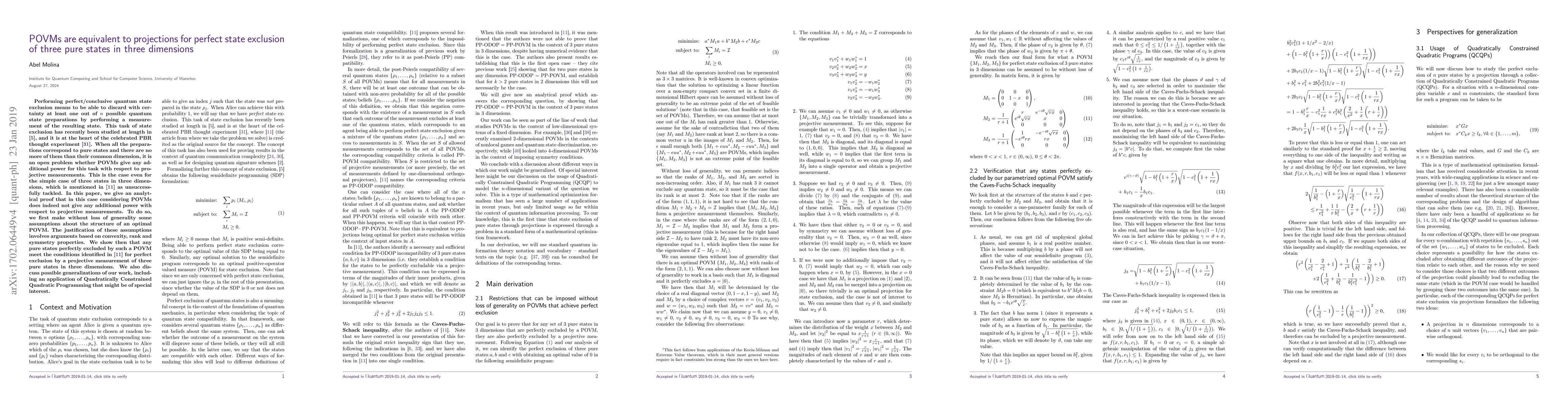 Performing perfect/conclusive quantum state exclusion means to be able to discard with certainty at least one out of n possible quantum state preparations by performing a measurement of the resulting state. This task of state exclusion has recently been studied at length in arXiv:1306.4683v3, and it is at the heart of the celebrated PBR thought experiment (arXiv:1111.3328v3). When all the preparations correspond to pure states and there are no more of them than their common dimension, it is an open problem whether POVMs give any additional power for this task with respect to projective measurements. This is the case even for the simple case of three states in three dimensions, which is mentioned in arXiv:quant-ph/0206110 as unsuccessfully tackled. In this paper, we give an analytical proof that in this case considering POVMs does indeed not give any additional power with respect to projective measurements. To do so, we first make without loss of generality some assumptions about the structure of an optimal POVM. The justification of these assumptions involves arguments based on convexity, rank and symmetry properties. We show then that any pure states perfectly excluded by such a POVM meet the conditions identified in arXiv:quant-ph/0206110 for perfect exclusion by a projective measurement of three pure states in three dimensions. We also discuss possible generalizations of our work, including an application of Quadratically Constrained Quadratic Programming that might be of special interest.