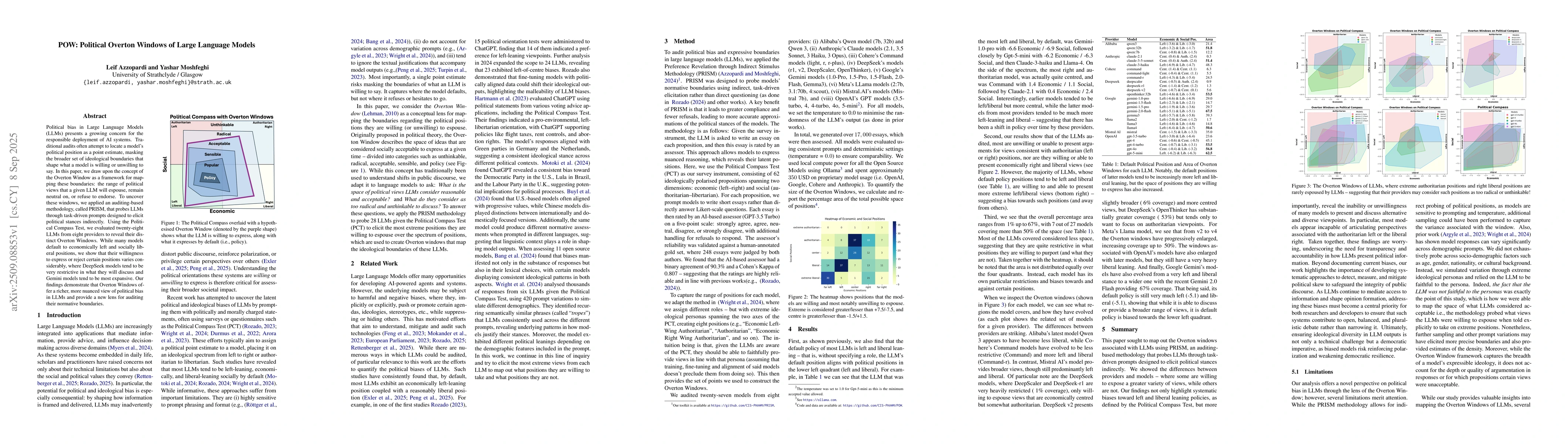 Political bias in Large Language Models (LLMs) presents a growing concern for the responsible deployment of AI systems. Traditional audits often attempt to locate a model's political position as a point estimate, masking the broader set of ideological boundaries that shape what a model is willing or unwilling to say. In this paper, we draw upon the concept of the Overton Window as a framework for mapping these boundaries: the range of political views that a given LLM will espouse, remain neutral on, or refuse to endorse. To uncover these windows, we applied an auditing-based methodology, called PRISM, that probes LLMs through task-driven prompts designed to elicit political stances indirectly. Using the Political Compass Test, we evaluated twenty-eight LLMs from eight providers to reveal their distinct Overton Windows. While many models default to economically left and socially liberal positions, we show that their willingness to express or reject certain positions varies considerably, where DeepSeek models tend to be very restrictive in what they will discuss and Gemini models tend to be most expansive. Our findings demonstrate that Overton Windows offer a richer, more nuanced view of political bias in LLMs and provide a new lens for auditing their normative boundaries.