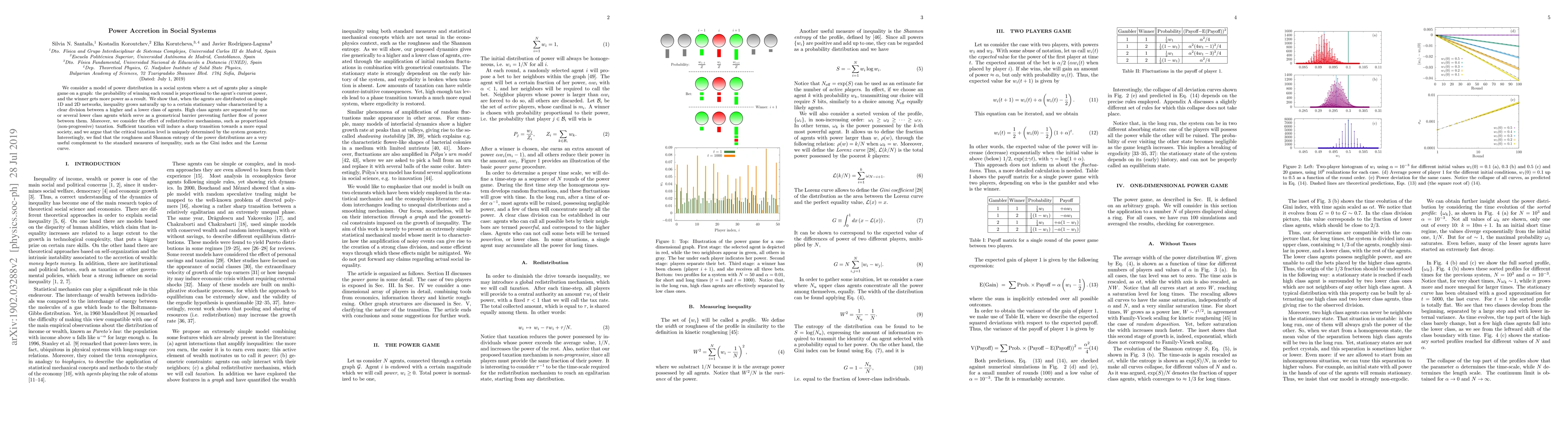 We consider a model of power distribution in a social system where a set of agents play a simple game on a graph: the probability of winning each round is proportional to the agent's current power, and the winner gets more power as a result. We show that, when the agents are distributed on simple 1D and 2D networks, inequality grows naturally up to a certain stationary value characterized by a clear division between a higher and a lower class of agents. High class agents are separated by one or several lower class agents which serve as a geometrical barrier preventing further flow of power between them. Moreover, we consider the effect of redistributive mechanisms, such as proportional (non-progressive) taxation. Sufficient taxation will induce a sharp transition towards a more equal society, and we argue that the critical taxation level is uniquely determined by the system geometry. Interestingly, we find that the roughness and Shannon entropy of the power distributions are a very useful complement to the standard measures of inequality, such as the Gini index and the Lorenz curve.
