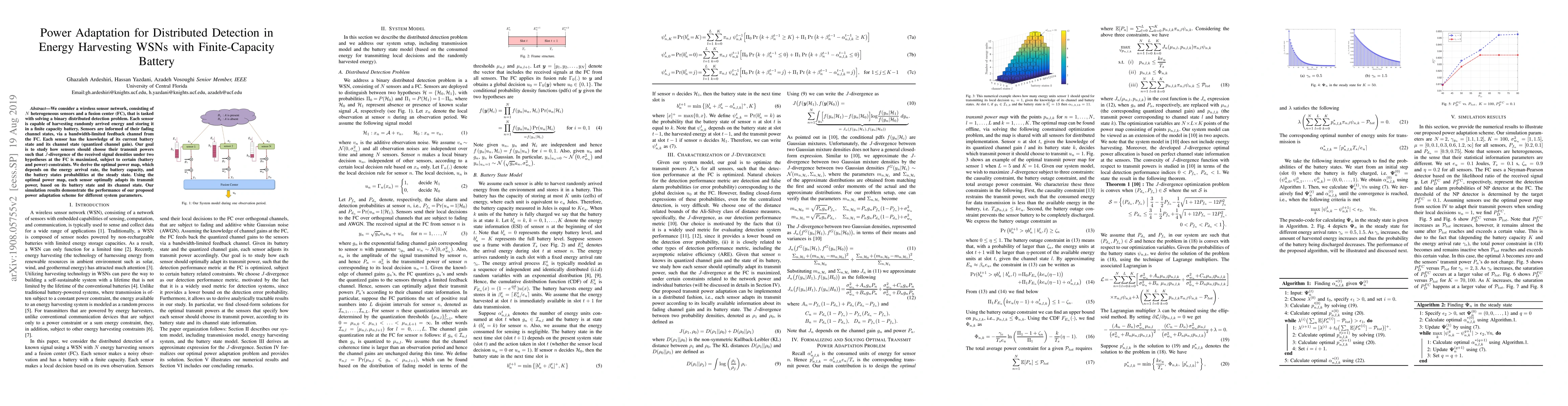 This paper investigates optimal power adaptation strategies for heterogeneous sensors in an energy harvesting wireless sensor network with finite-capacity batteries. The study derives an optimal power map that maximizes the J-divergence of received signal densities under constraints, and simulation results show its performance across various system parameters.