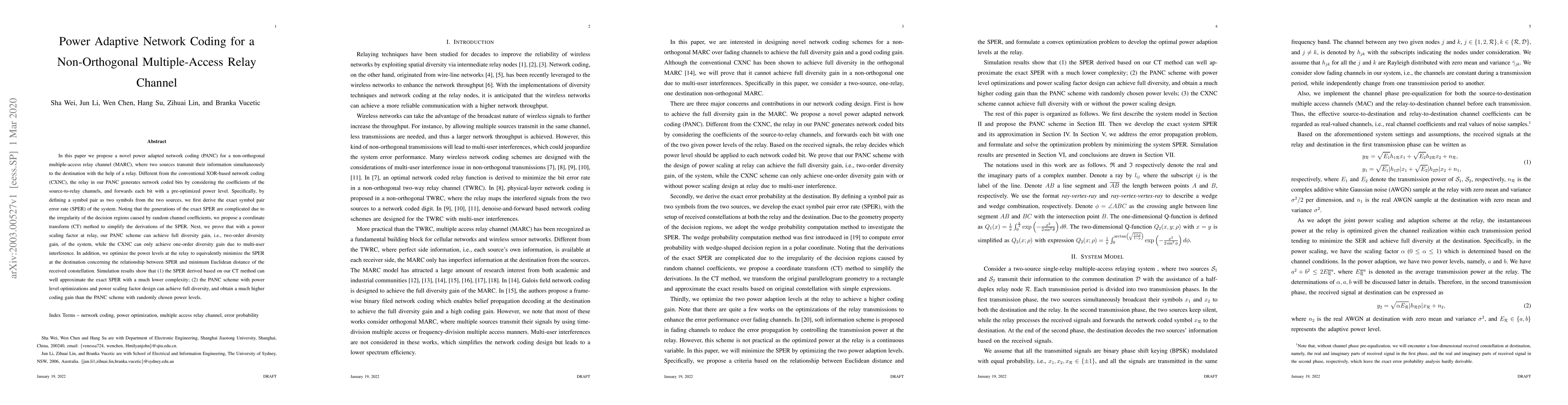 This paper proposes a power adaptive network coding (PANC) scheme for a non-orthogonal multiple-access relay channel, optimizing power levels at the relay to achieve full diversity gain and higher coding gain compared to conventional XOR-based network coding. The authors introduce a coordinate transform method to simplify the derivation of symbol pair error rates and demonstrate significant performance improvements through simulations.
