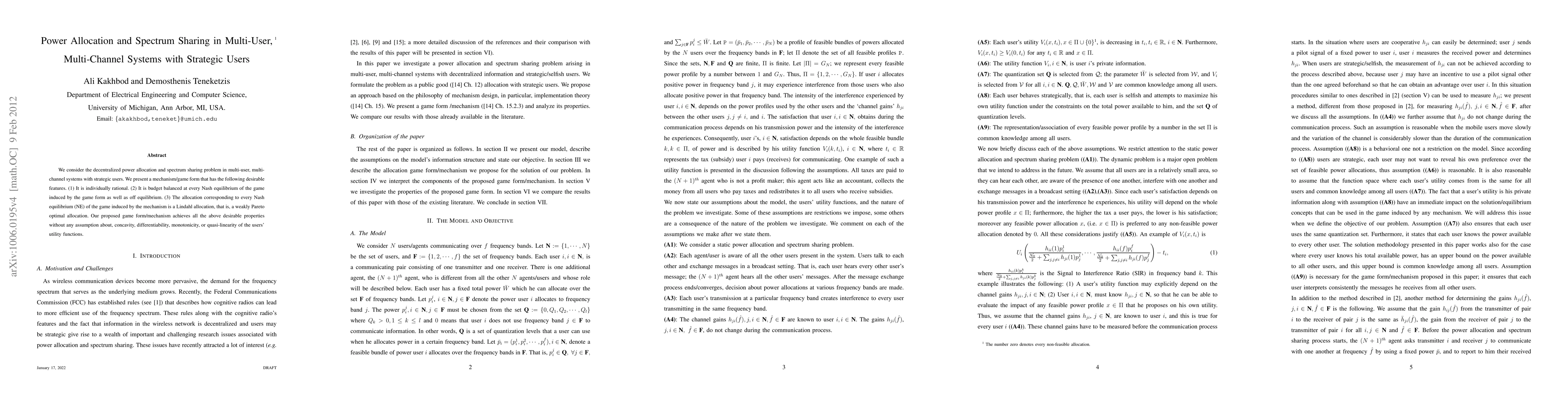 This paper proposes a decentralized mechanism for power allocation and spectrum sharing in multi-user, multi-channel systems where users are strategic. The mechanism ensures individual rationality, budget balance, and weak Pareto optimality at every Nash equilibrium, without requiring assumptions about utility functions' properties.