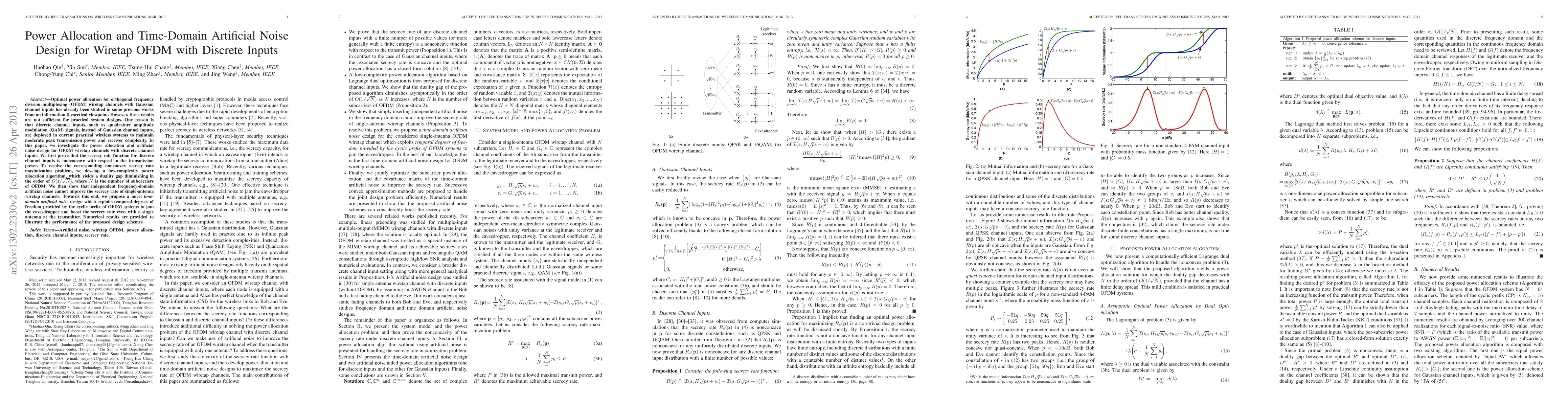 This paper investigates power allocation and artificial noise design for OFDM wiretap channels with discrete channel inputs, proving the nonconcavity of the secrecy rate function. It proposes a low-complexity power allocation algorithm and a novel time-domain artificial noise scheme to enhance secrecy rate, demonstrating improved performance through numerical results.