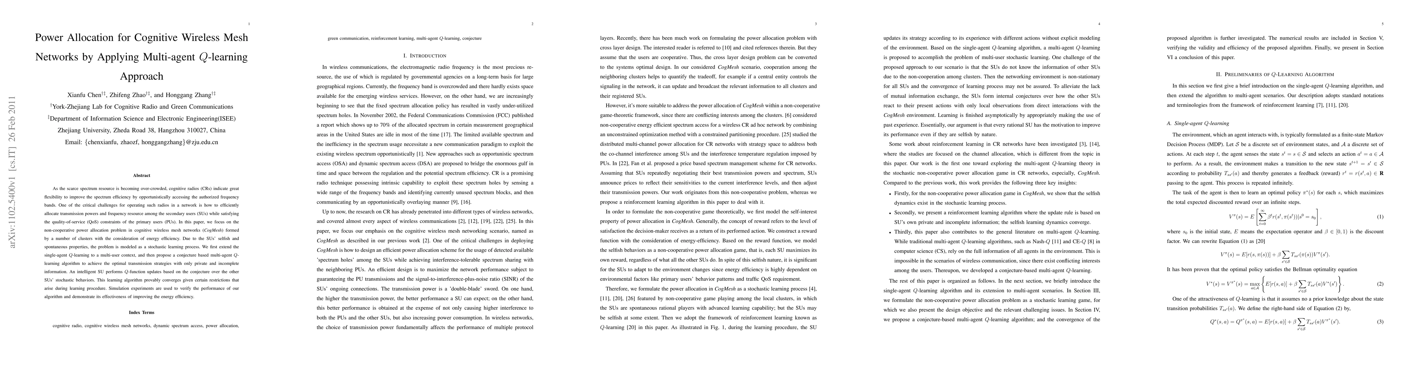 This paper proposes a multi-agent Q-learning approach for power allocation in cognitive wireless mesh networks to optimize energy efficiency while satisfying QoS constraints for primary users. The algorithm allows secondary users to learn optimal transmission strategies based on conjectures about others' behaviors, demonstrating improved energy efficiency through simulations.