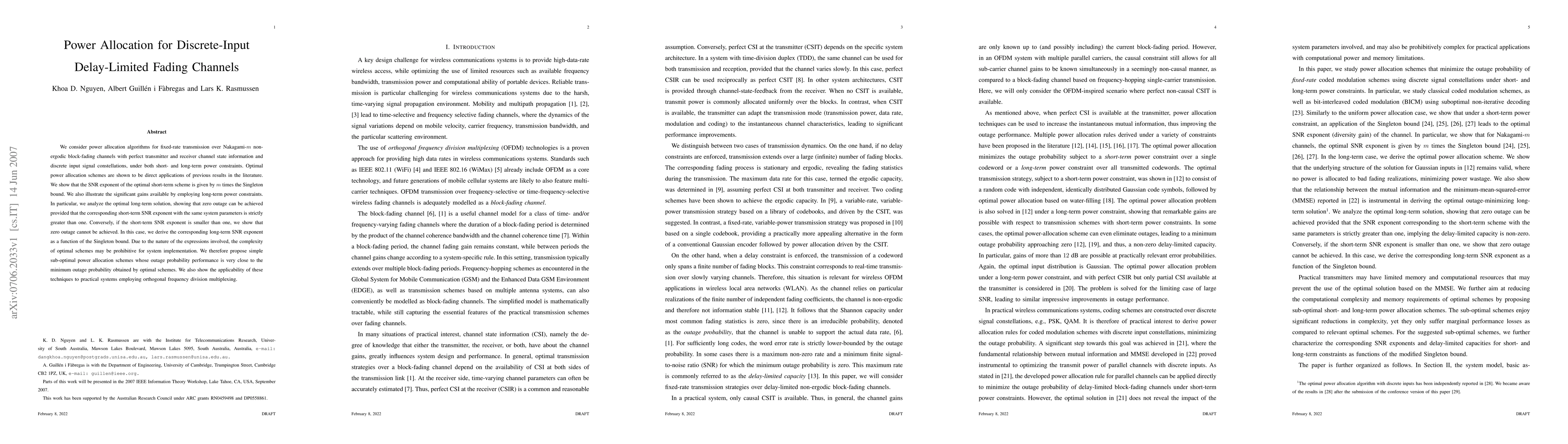 We consider power allocation algorithms for fixed-rate transmission over Nakagami-m non-ergodic block-fading channels with perfect transmitter and receiver channel state information and discrete input signal constellations, under both short- and long-term power constraints. Optimal power allocation schemes are shown to be direct applications of previous results in the literature. We show that the SNR exponent of the optimal short-term scheme is given by m times the Singleton bound. We also illustrate the significant gains available by employing long-term power constraints. In particular, we analyze the optimal long-term solution, showing that zero outage can be achieved provided that the corresponding short-term SNR exponent with the same system parameters is strictly greater than one. Conversely, if the short-term SNR exponent is smaller than one, we show that zero outage cannot be achieved. In this case, we derive the corresponding long-term SNR exponent as a function of the Singleton bound. Due to the nature of the expressions involved, the complexity of optimal schemes may be prohibitive for system implementation. We therefore propose simple sub-optimal power allocation schemes whose outage probability performance is very close to the minimum outage probability obtained by optimal schemes. We also show the applicability of these techniques to practical systems employing orthogonal frequency division multiplexing.