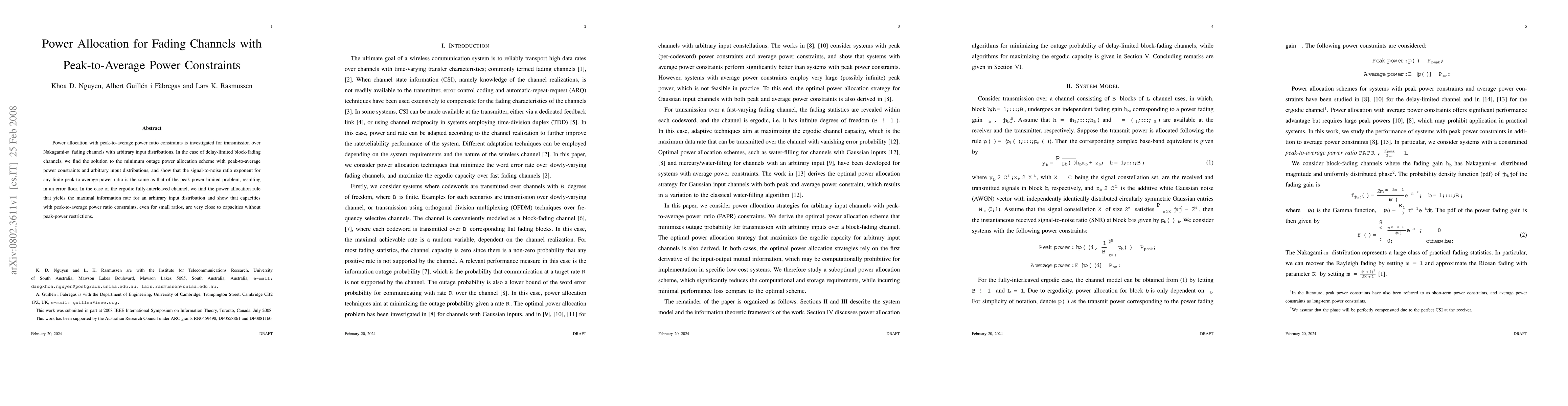 This paper investigates optimal power allocation strategies for Nakagami-m fading channels under peak-to-average power ratio constraints, demonstrating that minimum outage power allocation solutions yield similar signal-to-noise ratio exponents as peak-power limited problems, leading to an error floor. It also finds the power allocation rule maximizing information rate for ergodic fully-interleaved channels, showing capacities with peak-to-average power ratio constraints are nearly equivalent to those without such restrictions.