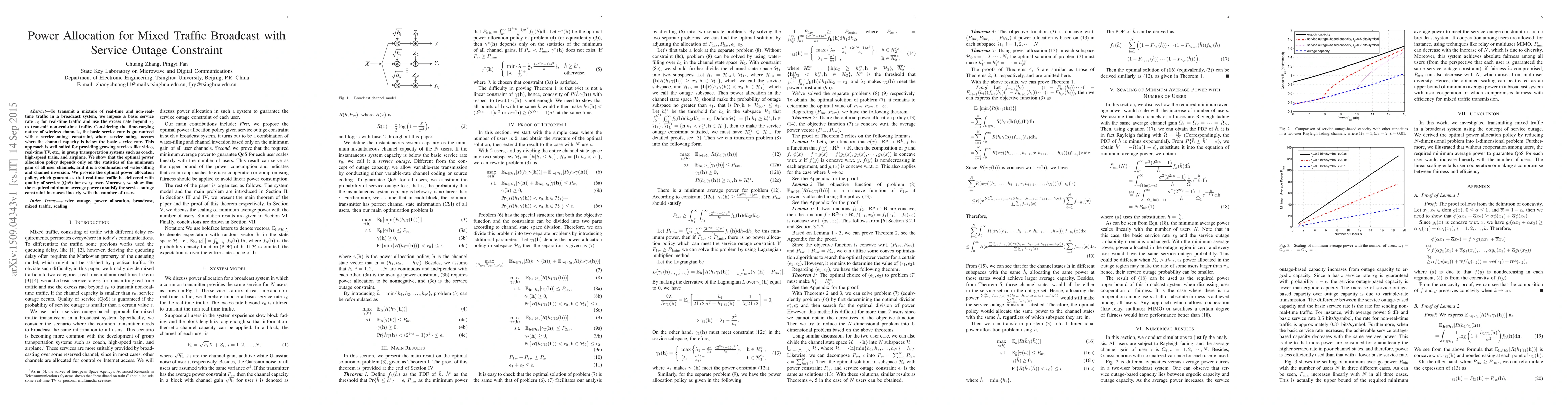 To transmit a mixture of real-time and non-real-time traffic in a broadcast system, we impose a basic service rate $r_0$ for real-time traffic and use the excess rate beyond $r_0$ to transmit non-real-time traffic. Considering the time-varying nature of wireless channels, the basic service rate is guaranteed with a service outage constraint, where service outage occurs when the channel capacity is below the basic service rate. This approach is well suited for providing growing services like video, real-time TV, etc., in group transportation systems such as coach, high-speed train, and airplane. We show that the optimal power allocation policy depends only on the statistics of the minimum gain of all user channels, and it is a combination of water-filling and channel inversion. We provide the optimal power allocation policy, which guarantees that real-time traffic be delivered with quality of service (QoS) for every user. Moreover, we show that the required minimum average power to satisfy the service outage constraint increases linearly with the number of users.
