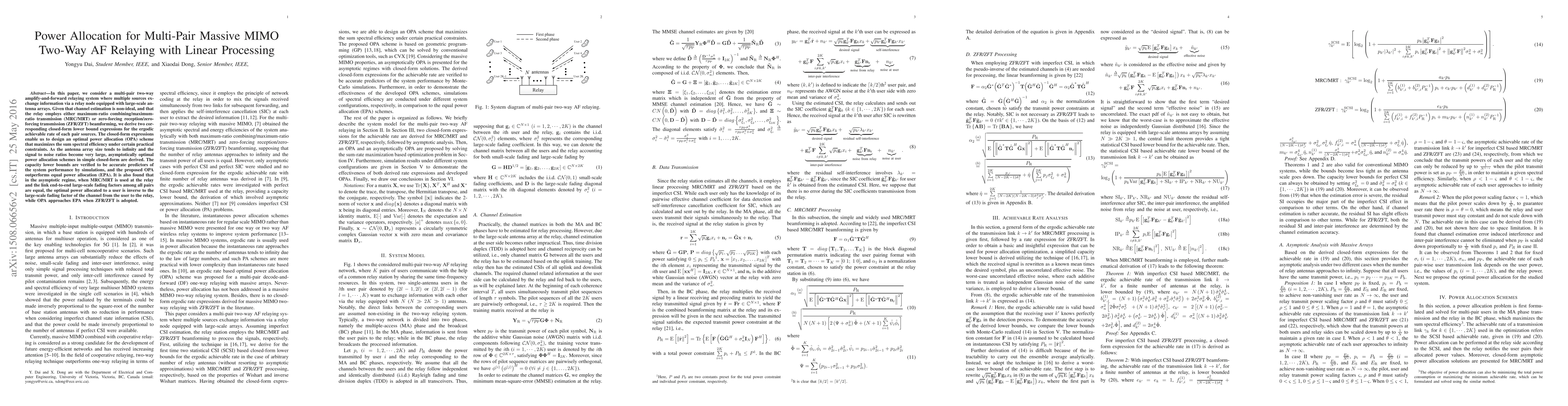 This paper proposes optimal power allocation schemes for multi-pair massive MIMO two-way relaying systems with linear processing, deriving closed-form lower bounds for ergodic achievable rates. The optimal allocation maximizes sum spectral efficiency and outperforms equal power allocation, especially in large-scale antenna scenarios.