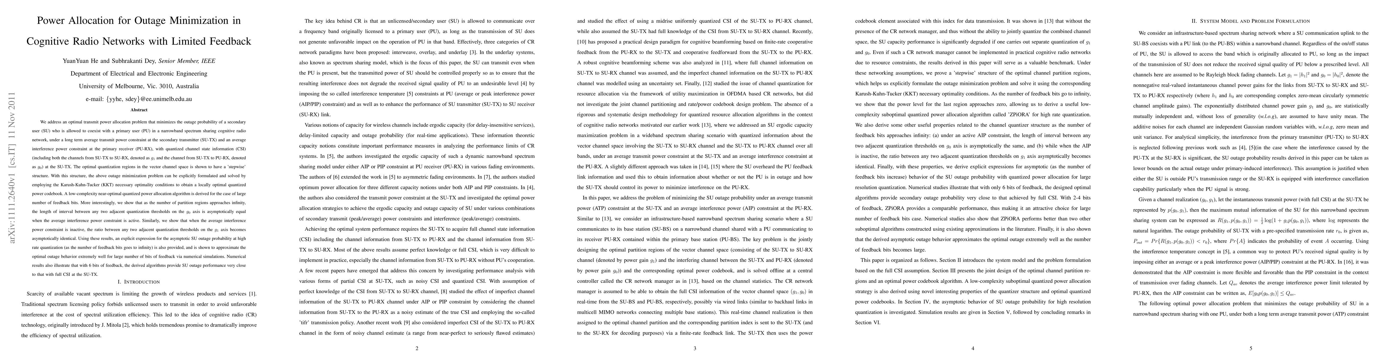 This paper proposes an optimal power allocation strategy to minimize the outage probability for a secondary user in a cognitive radio network, considering limited feedback and interference constraints. It employs the Karush-Kuhn-Tucker conditions to derive a locally optimal quantized power codebook and provides a low-complexity near-optimal algorithm for large feedback bit scenarios.