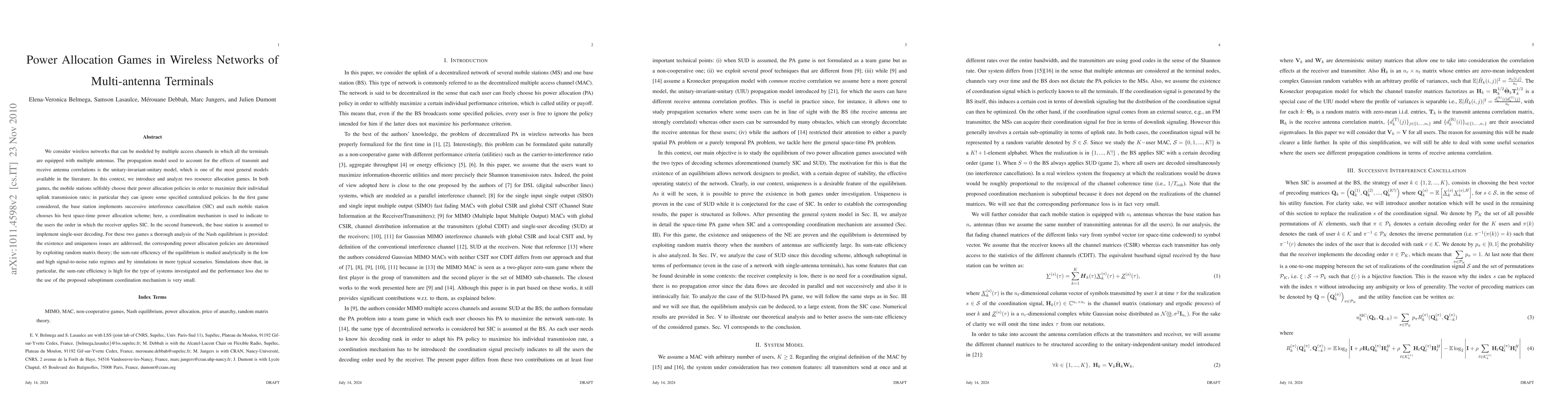 We consider wireless networks that can be modeled by multiple access channels in which all the terminals are equipped with multiple antennas. The propagation model used to account for the effects of transmit and receive antenna correlations is the unitary-invariant-unitary model, which is one of the most general models available in the literature. In this context, we introduce and analyze two resource allocation games. In both games, the mobile stations selfishly choose their power allocation policies in order to maximize their individual uplink transmission rates; in particular they can ignore some specified centralized policies. In the first game considered, the base station implements successive interference cancellation (SIC) and each mobile station chooses his best space-time power allocation scheme; here, a coordination mechanism is used to indicate to the users the order in which the receiver applies SIC. In the second framework, the base station is assumed to implement single-user decoding. For these two games a thorough analysis of the Nash equilibrium is provided: the existence and uniqueness issues are addressed; the corresponding power allocation policies are determined by exploiting random matrix theory; the sum-rate efficiency of the equilibrium is studied analytically in the low and high signal-to-noise ratio regimes and by simulations in more typical scenarios. Simulations show that, in particular, the sum-rate efficiency is high for the type of systems investigated and the performance loss due to the use of the proposed suboptimum coordination mechanism is very small.