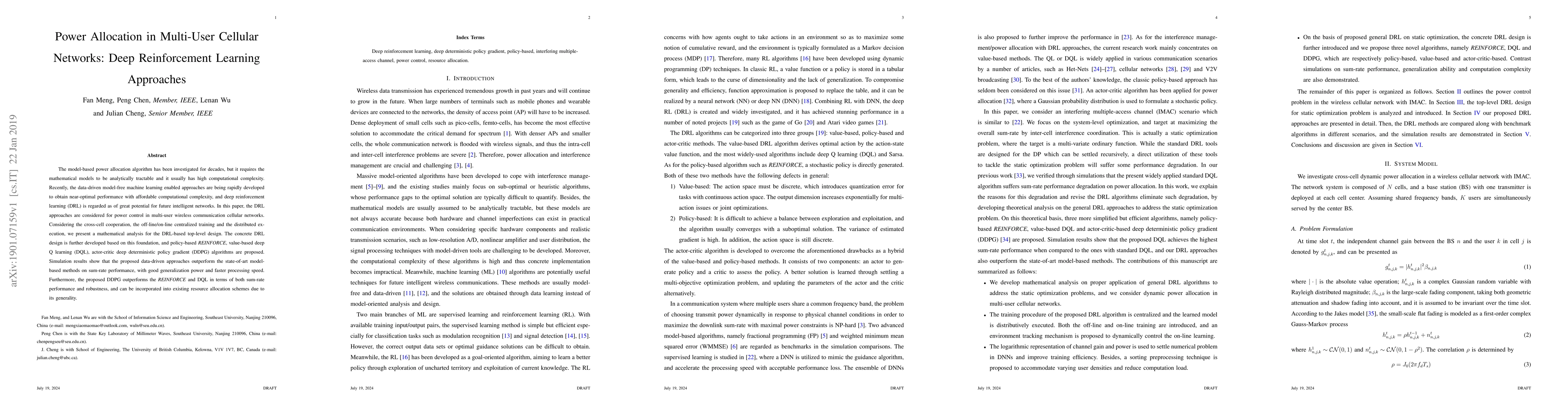 This paper explores deep reinforcement learning (DRL) approaches for power allocation in multi-user cellular networks, proposing policy-based, value-based, and actor-critic DRL algorithms. Simulation results demonstrate that DRL outperforms traditional model-based methods in sum-rate performance, generalization, and processing speed, with DDPG showing the best overall performance and robustness.