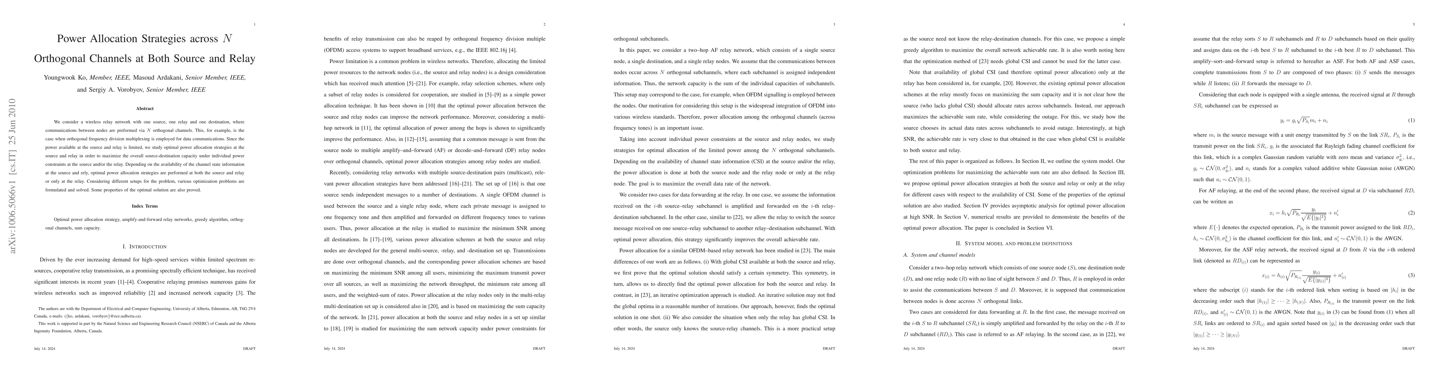 This paper investigates optimal power allocation strategies for a wireless relay network using N orthogonal channels, aiming to maximize source-destination capacity under power constraints. The study formulates and solves optimization problems based on the availability of channel state information, proving properties of the optimal solution.