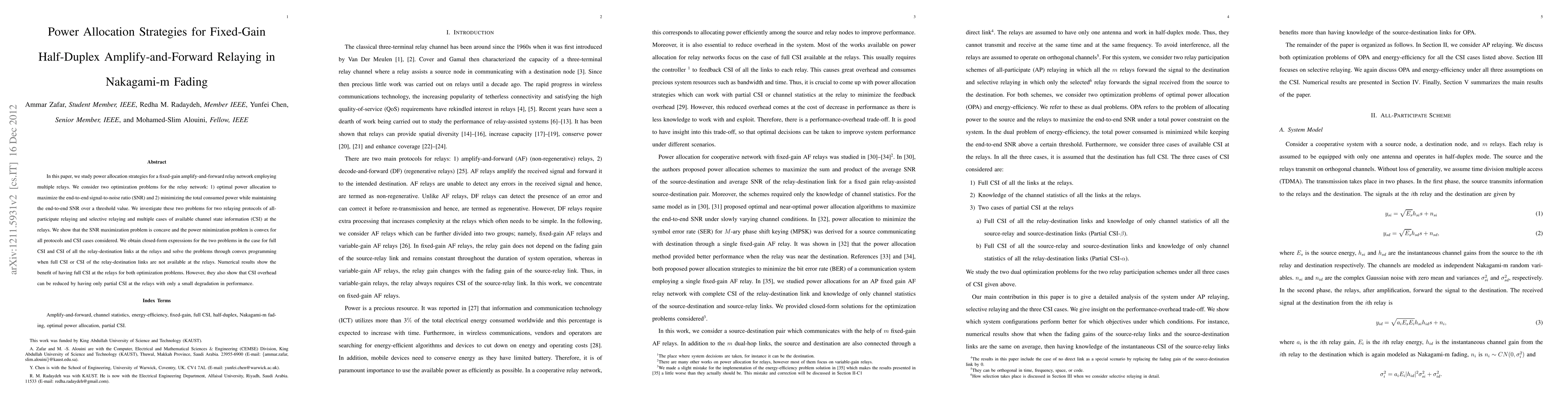 This paper explores optimal power allocation strategies for fixed-gain amplify-and-forward relay networks in Nakagami-m fading, focusing on maximizing end-to-end SNR and minimizing total power consumption. It provides closed-form solutions for full channel state information and convex programming for partial information, revealing benefits and trade-offs of full versus partial CSI.