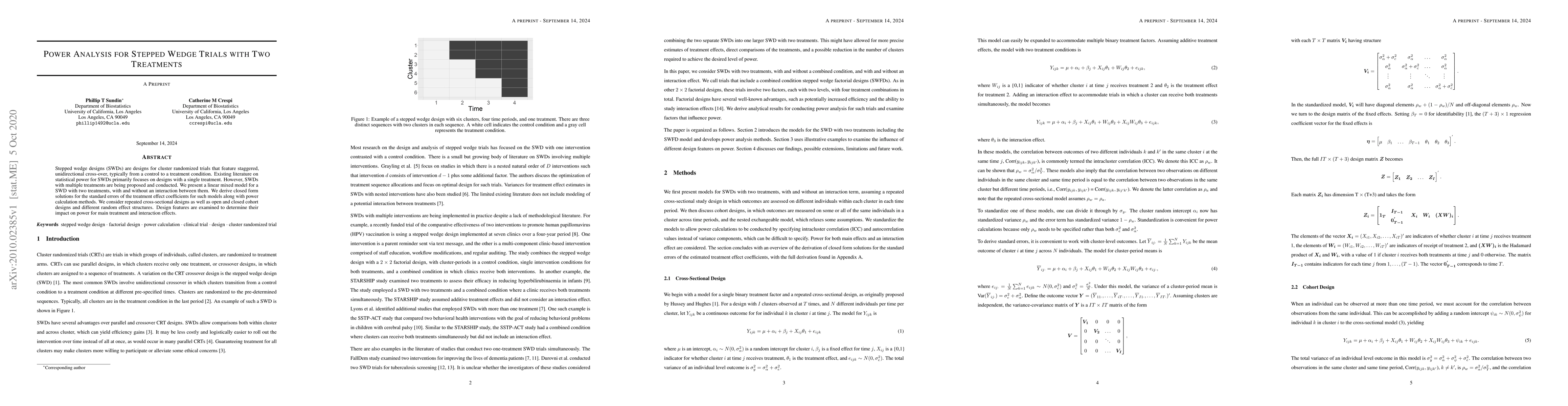 This paper presents a linear mixed model for stepped wedge trials with two treatments, deriving closed form solutions for standard errors and power calculation methods. It examines various design features to determine their impact on the power for main treatment and interaction effects in different trial structures.