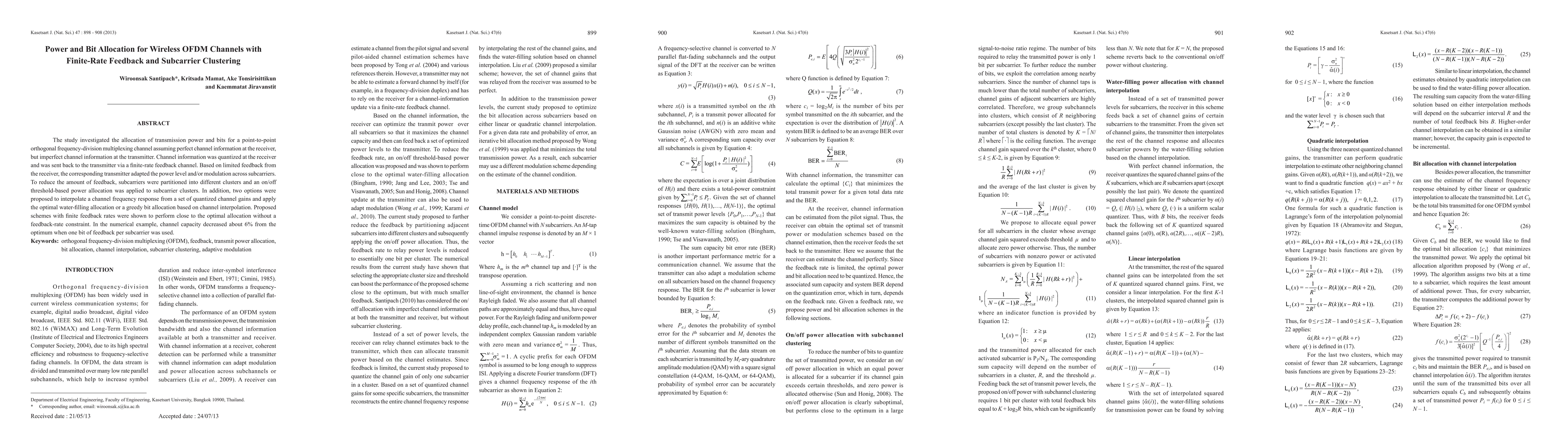 The study investigated the allocation of transmission power and bits for a point-to-point orthogonal frequency-division multiplexing channel assuming perfect channel information at the receiver, but imperfect channel information at the transmitter. Channel information was quantized at the receiver and was sent back to the transmitter via a finite-rate feedback channel. Based on limited feedback from the receiver, the corresponding transmitter adapted the power level and/or modulation across subcarriers. To reduce the amount of feedback, subcarriers were partitioned into different clusters and an on/off threshold-based power allocation was applied to subcarrier clusters. In addition, two options were proposed to interpolate a channel frequency response from a set of quantized channel gains and apply the optimal water-filling allocation or a greedy bit allocation based on channel interpolation. Proposed schemes with finite feedback rates were shown to perform close to the optimal allocation without a feedback-rate constraint. In the numerical example, channel capacity decreased about 6% from the optimum when one bit of feedback per subcarrier was used.
