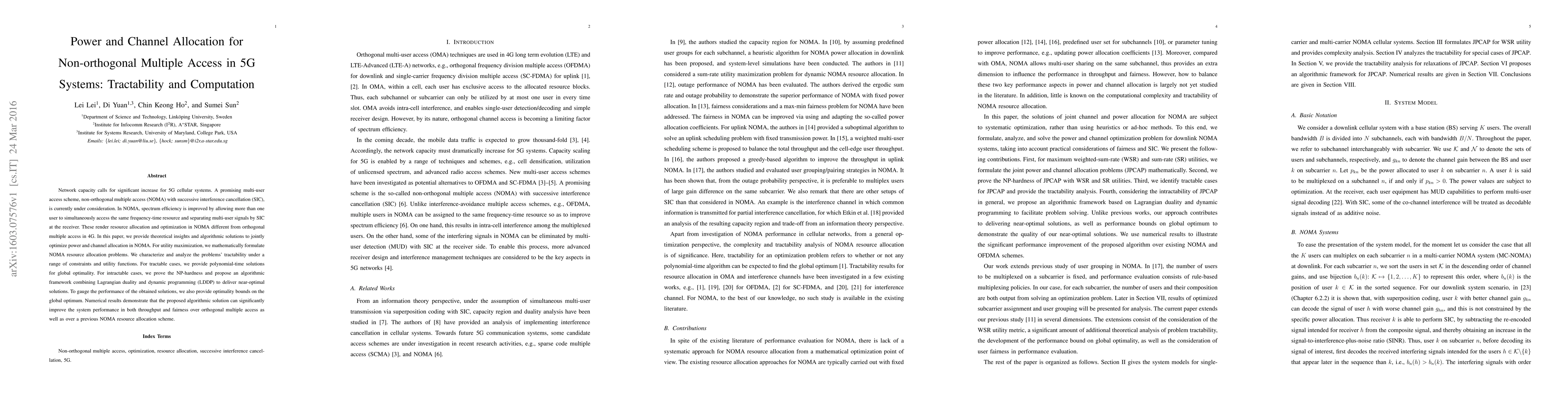 This paper explores resource allocation strategies for non-orthogonal multiple access (NOMA) in 5G systems, focusing on optimizing power and channel allocation. It provides theoretical insights and algorithmic solutions, offering polynomial-time global optimal solutions for tractable cases and near-optimal solutions via Lagrangian duality and dynamic programming for intractable cases.