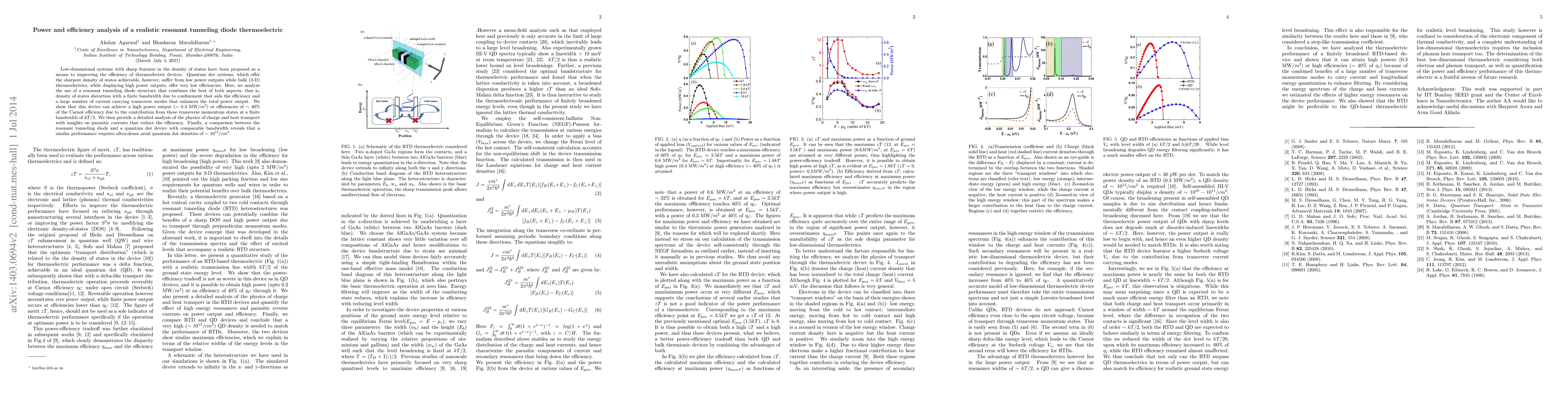 This paper analyzes the power and efficiency of a resonant tunneling diode for thermoelectric applications, demonstrating it can achieve a high power output of approximately 0.3 MW/m² at efficiencies around 40% of the Carnot limit, outperforming quantum dot systems that require extremely high areal densities.