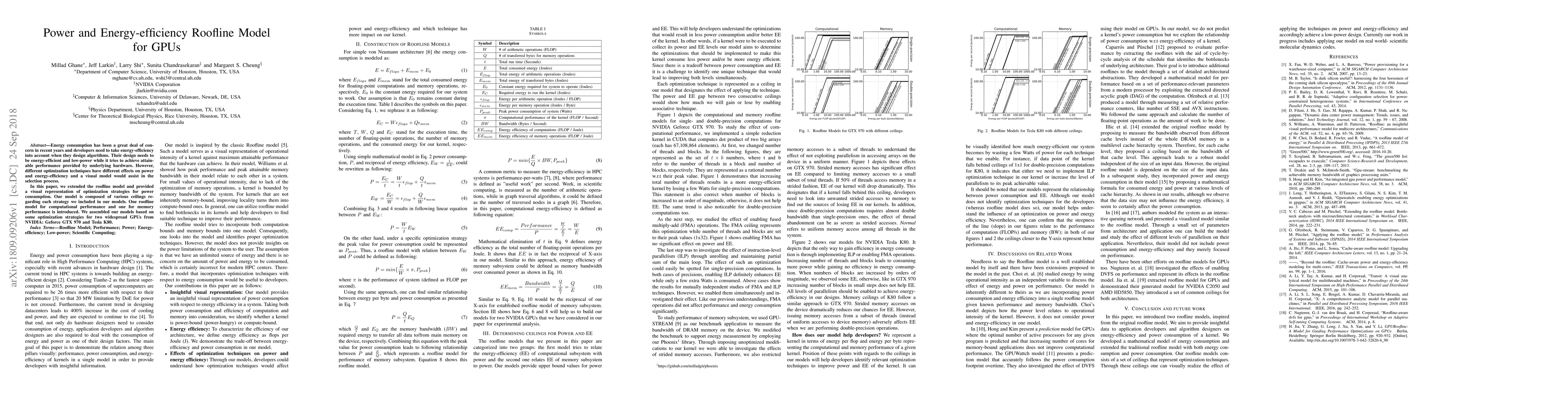 Energy consumption has been a great deal of concern in recent years and developers need to take energy-efficiency into account when they design algorithms. Their design needs to be energy-efficient and low-power while it tries to achieve attainable performance provided by underlying hardware. However, different optimization techniques have different effects on power and energy-efficiency and a visual model would assist in the selection process. In this paper, we extended the roofline model and provided a visual representation of optimization strategies for power consumption. Our model is composed of various ceilings regarding each strategy we included in our models. One roofline model for computational performance and one for memory performance is introduced. We assembled our models based on some optimization strategies for two widespread GPUs from NVIDIA: Geforce GTX 970 and Tesla K80.