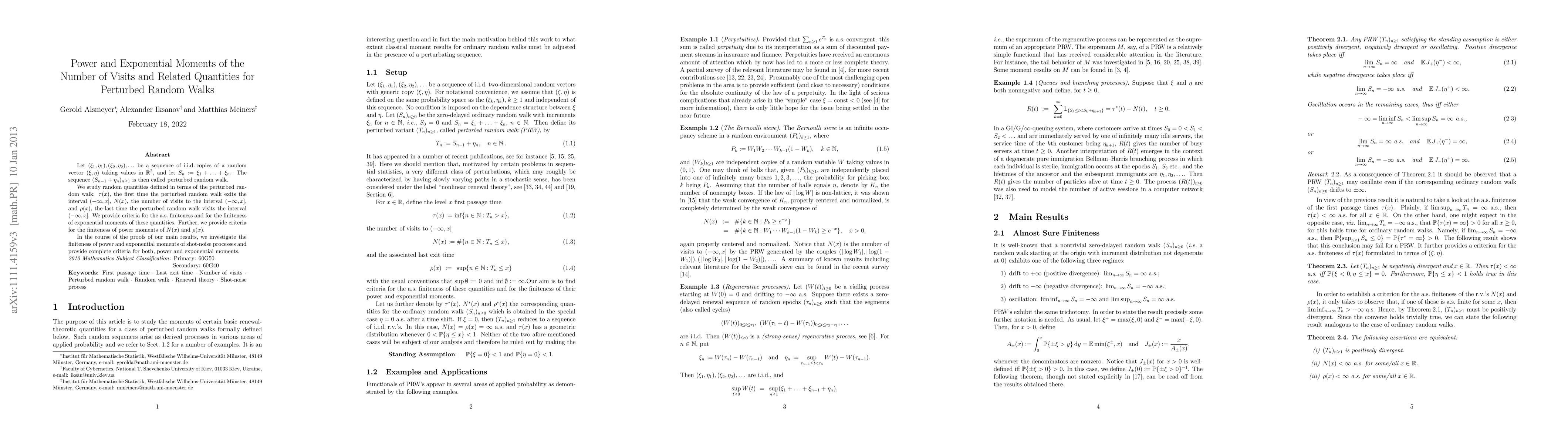 This paper explores the properties of perturbed random walks defined by a sequence of i.i.d. random vectors. It examines the first exit time, visit count, and last visit time within a specified interval, providing criteria for the almost sure finiteness and finiteness of exponential and power moments of these quantities.