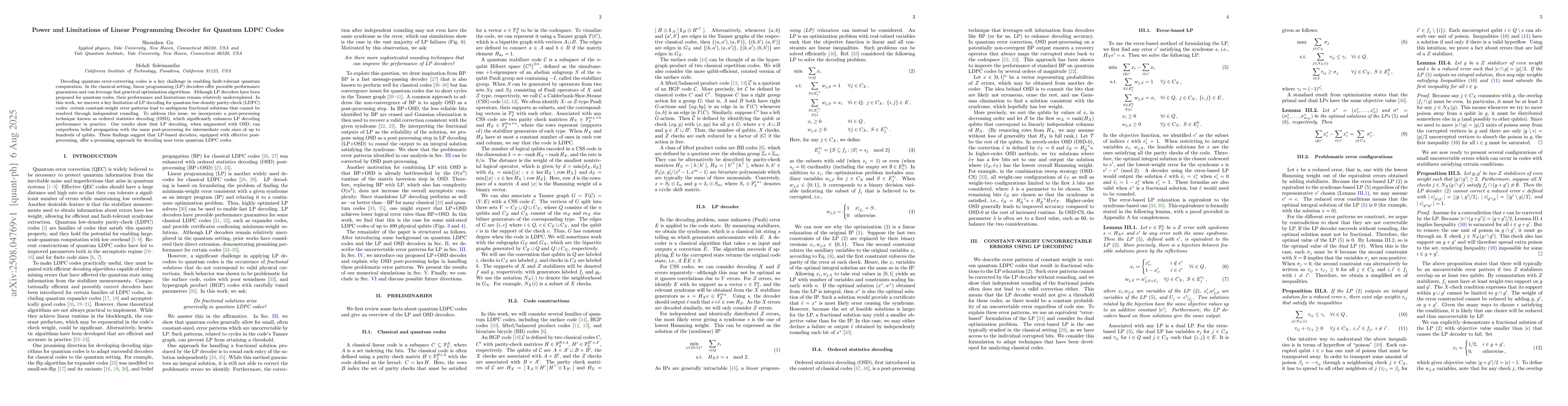 Decoding quantum error-correcting codes is a key challenge in enabling fault-tolerant quantum computation. In the classical setting, linear programming (LP) decoders offer provable performance guarantees and can leverage fast practical optimization algorithms. Although LP decoders have been proposed for quantum codes, their performance and limitations remain relatively underexplored. In this work, we uncover a key limitation of LP decoding for quantum low-density parity-check (LDPC) codes: certain constant-weight error patterns lead to ambiguous fractional solutions that cannot be resolved through independent rounding. To address this issue, we incorporate a post-processing technique known as ordered statistics decoding (OSD), which significantly enhances LP decoding performance in practice. Our results show that LP decoding, when augmented with OSD, can outperform belief propagation with the same post-processing for intermediate code sizes of up to hundreds of qubits. These findings suggest that LP-based decoders, equipped with effective post-processing, offer a promising approach for decoding near-term quantum LDPC codes.