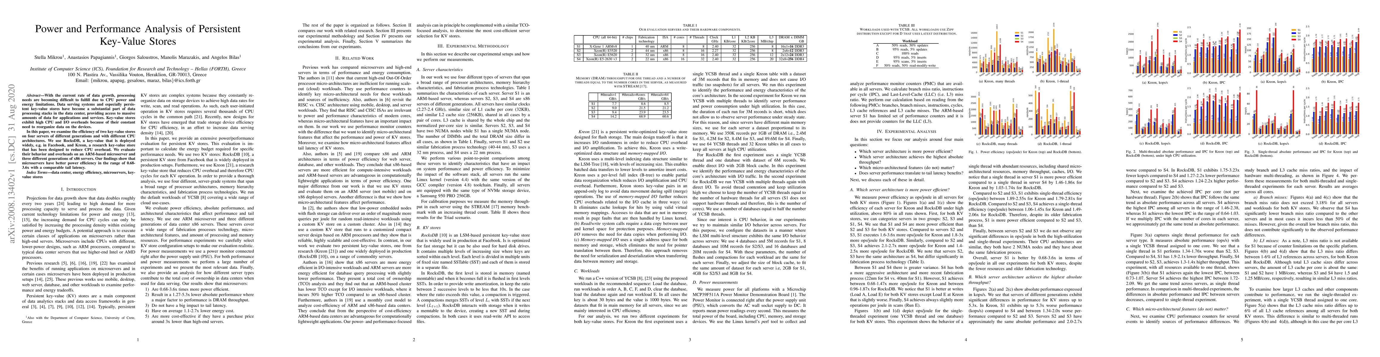 This paper analyzes the power and performance of two key-value stores, RocksDB and Kreon, across servers of varying generations and architectures. Results indicate that ARM-based microservers offer significantly better power efficiency, up to 3.6x, while maintaining comparable latency.