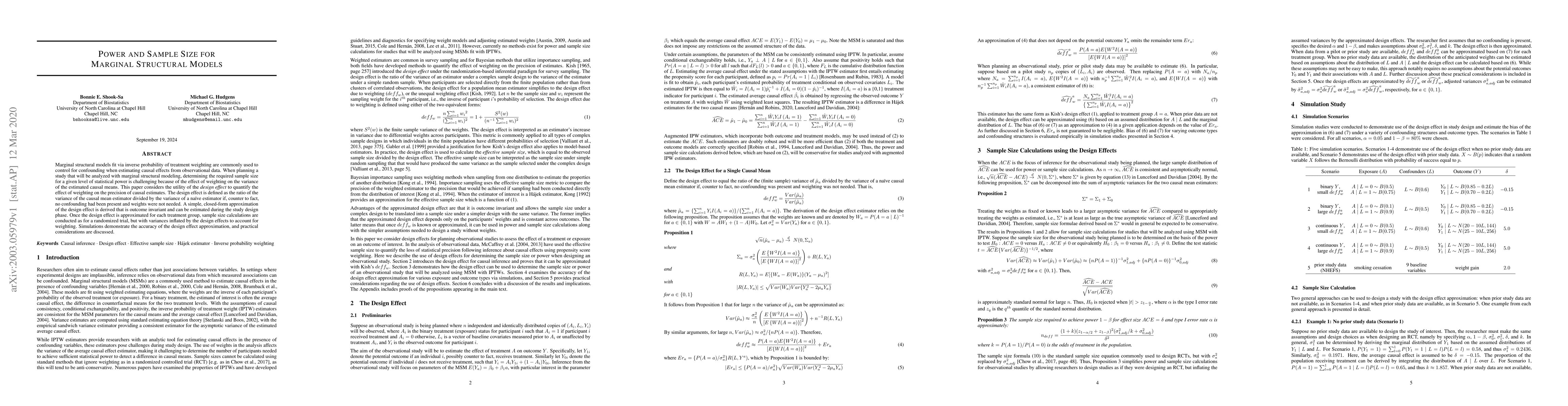 This paper proposes a method for estimating sample size for marginal structural models using a design effect to account for the variance inflation due to inverse probability weighting. A simple, closed-form approximation of the design effect is derived, allowing for accurate sample size calculations that adjust for the effects of confounding.