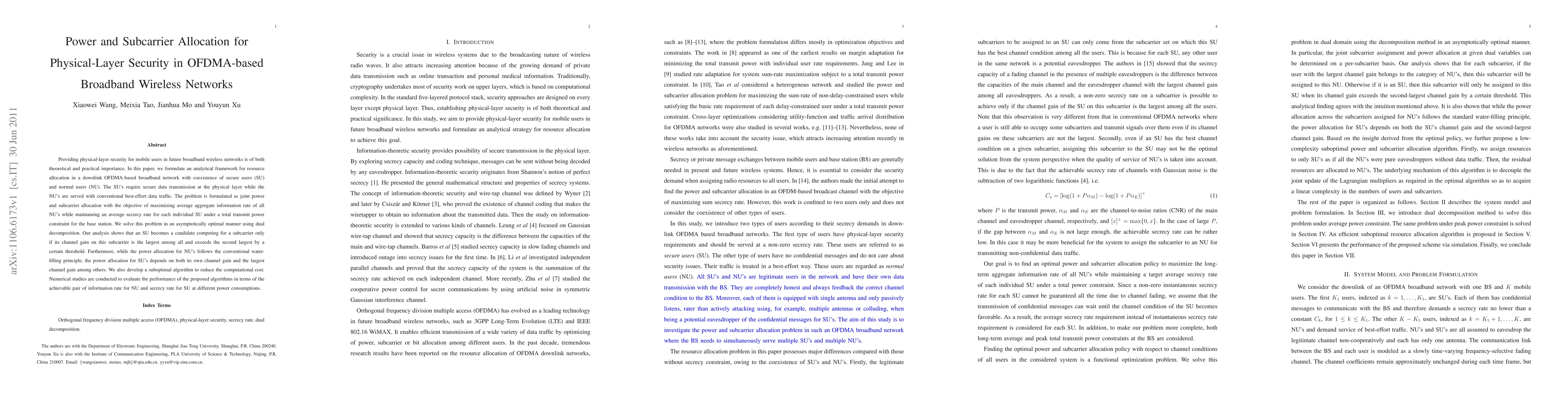 Providing physical-layer security for mobile users in future broadband wireless networks is of both theoretical and practical importance. In this paper, we formulate an analytical framework for resource allocation in a downlink OFDMA-based broadband network with coexistence of secure users (SU) and normal users (NU). The SU's require secure data transmission at the physical layer while the NU's are served with conventional best-effort data traffic. The problem is formulated as joint power and subcarrier allocation with the objective of maximizing average aggregate information rate of all NU's while maintaining an average secrecy rate for each individual SU under a total transmit power constraint for the base station. We solve this problem in an asymptotically optimal manner using dual decomposition. Our analysis shows that an SU becomes a candidate competing for a subcarrier only if its channel gain on this subcarrier is the largest among all and exceeds the second largest by a certain threshold. Furthermore, while the power allocation for NU's follows the conventional water-filling principle, the power allocation for SU's depends on both its own channel gain and the largest channel gain among others. We also develop a suboptimal algorithm to reduce the computational cost. Numerical studies are conducted to evaluate the performance of the proposed algorithms in terms of the achievable pair of information rate for NU and secrecy rate for SU at different power consumptions.