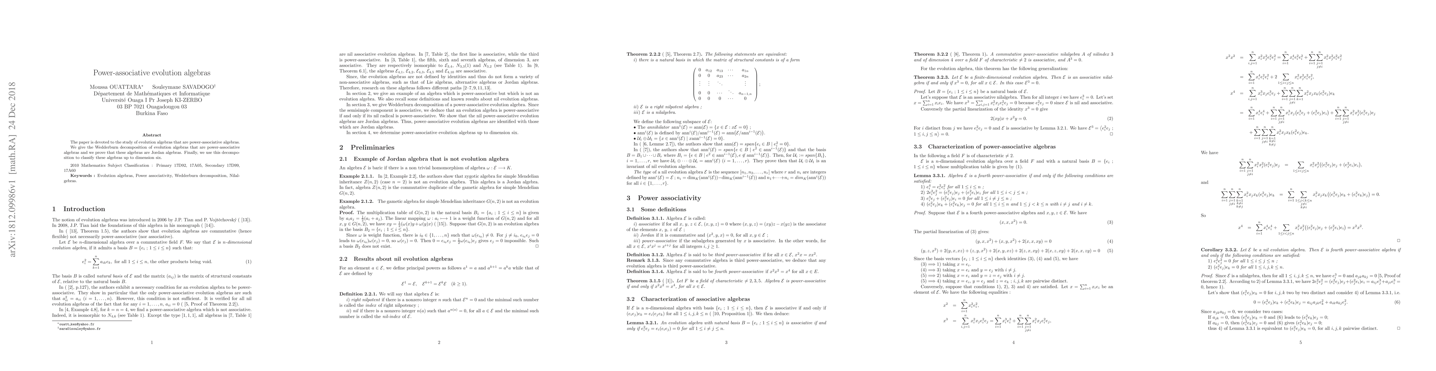 This paper explores power-associative evolution algebras, providing their Wedderburn decomposition and proving they are Jordan algebras. It classifies these algebras up to dimension six using this decomposition.