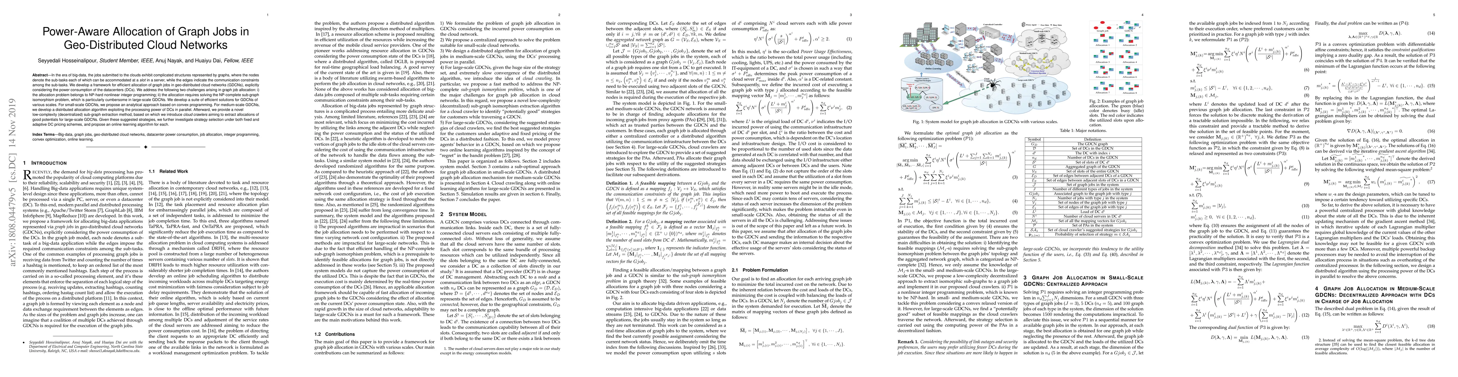 This paper proposes a framework for efficient allocation of graph jobs in geo-distributed cloud networks (GDCNs) that minimizes power consumption, addressing complex challenges like NP-hard nonlinear integer programming and sub-graph isomorphism.