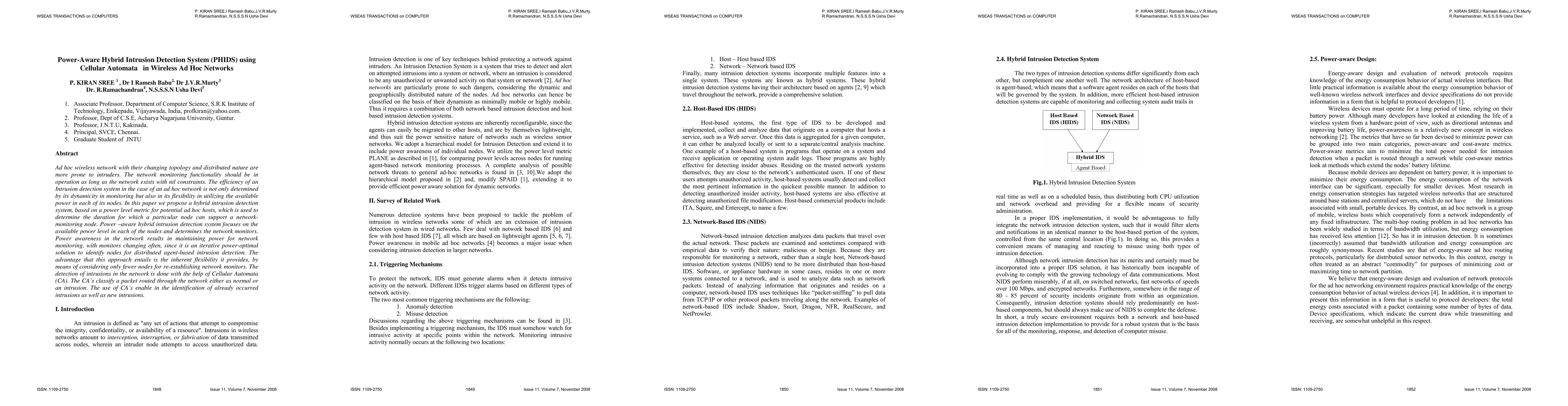 Adhoc wireless network with their changing topology and distributed nature are more prone to intruders. The network monitoring functionality should be in operation as long as the network exists with nil constraints. The efficiency of an Intrusion detection system in the case of an adhoc network is not only determined by its dynamicity in monitoring but also in its flexibility in utilizing the available power in each of its nodes. In this paper we propose a hybrid intrusion detection system, based on a power level metric for potential adhoc hosts, which is used to determine the duration for which a particular node can support a network monitoring node. Power aware hybrid intrusion detection system focuses on the available power level in each of the nodes and determines the network monitors. Power awareness in the network results in maintaining power for network monitoring, with monitors changing often, since it is an iterative power optimal solution to identify nodes for distributed agent based intrusion detection. The advantage that this approach entails is the inherent flexibility it provides, by means of considering only fewer nodes for reestablishing network monitors. The detection of intrusions in the network is done with the help of Cellular Automat CA. The CAs classify a packet routed through the network either as normal or an intrusion. The use of CAs enable in the identification of already occurred intrusions as well as new intrusions.