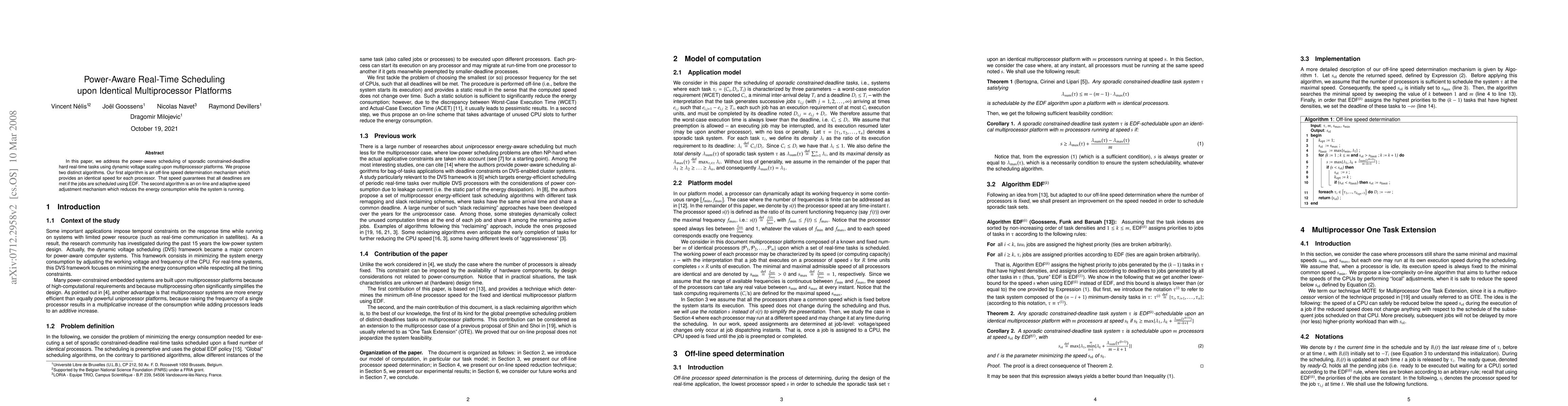 This paper proposes algorithms for power-aware scheduling of real-time tasks on multiprocessor platforms using dynamic voltage scaling. It includes an off-line speed determination algorithm ensuring deadlines with EDF and an on-line adaptive speed adjustment algorithm to minimize energy consumption during runtime.