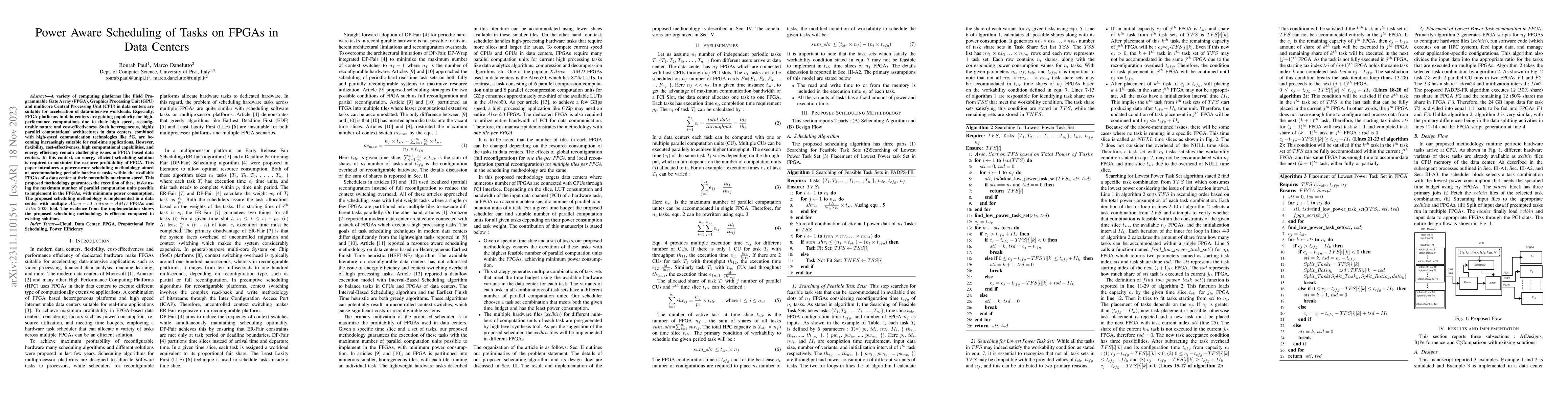 A variety of computing platform like Field Programmable Gate Array (FPGA), Graphics Processing Unit (GPU) and multicore Central Processing Unit (CPU) in data centers are suitable for acceleration of data-intensive workloads. Especially, FPGA platforms in data centers are gaining popularity for high-performance computations due to their high speed, reconfigurable nature and cost effectiveness. Such heterogeneous, highly parallel computational architectures in data centers, combined with high-speed communication technologies like 5G, are becoming increasingly suitable for real-time applications. However, flexibility, cost-effectiveness, high computational capabilities, and energy efficiency remain challenging issues in FPGA based data centers. In this context an energy efficient scheduling solution is required to maximize the resource profitability of FPGA. This paper introduces a power-aware scheduling methodology aimed at accommodating periodic hardware tasks within the available FPGAs of a data center at their potentially maximum speed. This proposed methodology guarantees the execution of these tasks us ing the maximum number of parallel computation units possible to implement in the FPGAs, with minimum power consumption. The proposed scheduling methodology is implemented in a data center with multiple Alveo-50 Xilinx-AMD FPGAs and Vitis 2023 tool. The evidence from the implementation shows the proposed scheduling methodology is efficient compared to existing solutions.