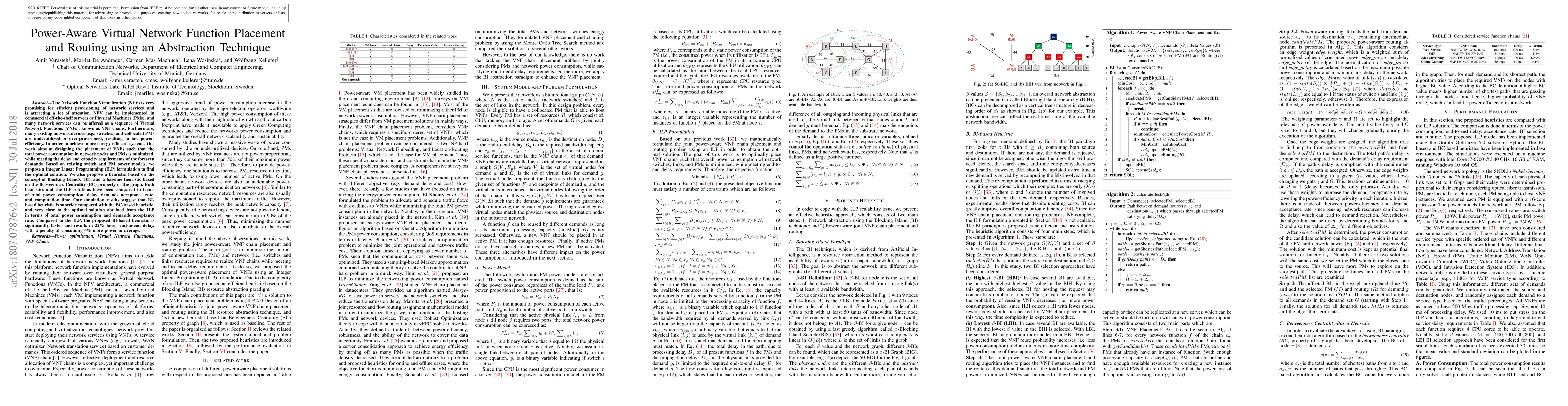 This paper proposes methods for power-aware placement and routing of Virtual Network Functions (VNFs) to minimize power consumption while meeting network demands. It introduces an Integer Linear Programming (ILP) formulation and two heuristics—Blocking Islands (BI) and Betweenness Centrality (BC)—to optimize VNF placement. The BI-based heuristic is shown to be faster and nearly as effective as the ILP in reducing power consumption and meeting demand, with a slight increase in power usage and lower end-to-end delay.