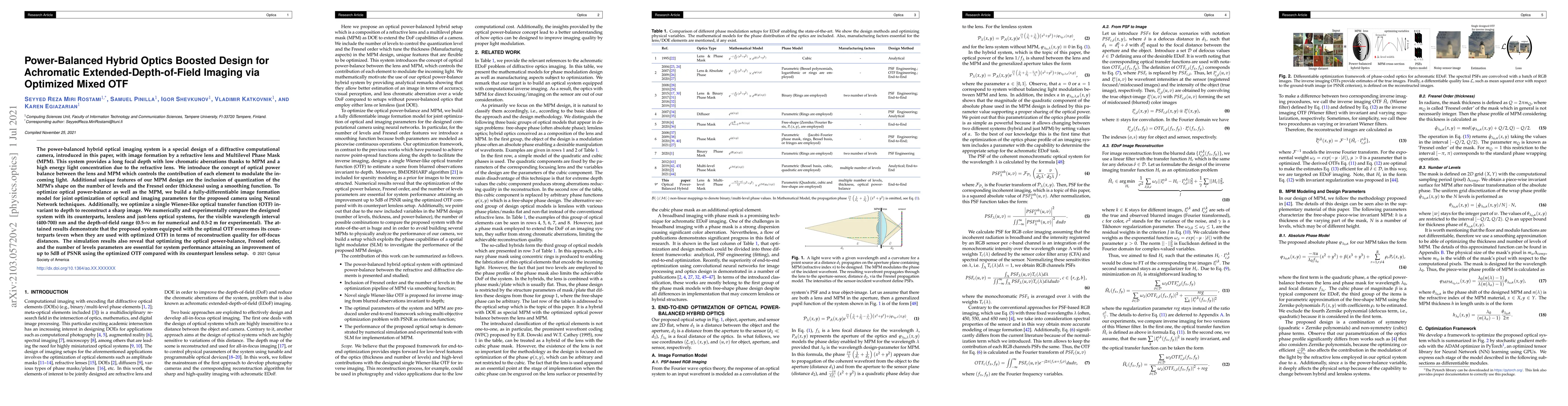 The power-balanced hybrid optical imaging system is a special design of a diffractive computational camera, introduced in this paper, with image formation by a refractive lens and Multilevel Phase Mask (MPM). This system provides a long focal depth with low chromatic aberrations thanks to MPM and a high energy light concentration due to the refractive lens. We introduce the concept of optical power balance between the lens and MPM which controls the contribution of each element to modulate the incoming light. Additional unique features of our MPM design are the inclusion of quantization of the MPM's shape on the number of levels and the Fresnel order (thickness) using a smoothing function. To optimize optical power-balance as well as the MPM, we build a fully-differentiable image formation model for joint optimization of optical and imaging parameters for the proposed camera using Neural Network techniques. Additionally, we optimize a single Wiener-like optical transfer function (OTF) invariant to depth to reconstruct a sharp image. We numerically and experimentally compare the designed system with its counterparts, lensless and just-lens optical systems, for the visible wavelength interval (400-700)nm and the depth-of-field range (0.5-$\infty$m for numerical and 0.5-2m for experimental). The attained results demonstrate that the proposed system equipped with the optimal OTF overcomes its counterparts (even when they are used with optimized OTF) in terms of reconstruction quality for off-focus distances. The simulation results also reveal that optimizing the optical power-balance, Fresnel order, and the number of levels parameters are essential for system performance attaining an improvement of up to 5dB of PSNR using the optimized OTF compared with its counterpart lensless setup.
